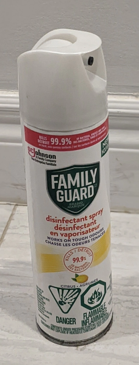 Giving away a can of Family Guard disinfectant spray. It kills 99.9% of bacteria and viruses, and works on tough odours. The scent is citrus. Perfect for keeping your home clean and fresh!