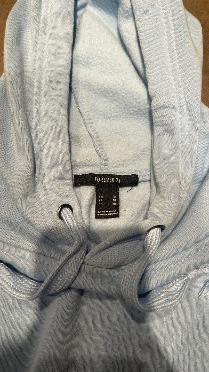 Selling a comfy Forever 21 hoodie in a lovely light blue! It's a size medium and in great condition. Perfect for cozy days or layering up. From a smoke-free home!