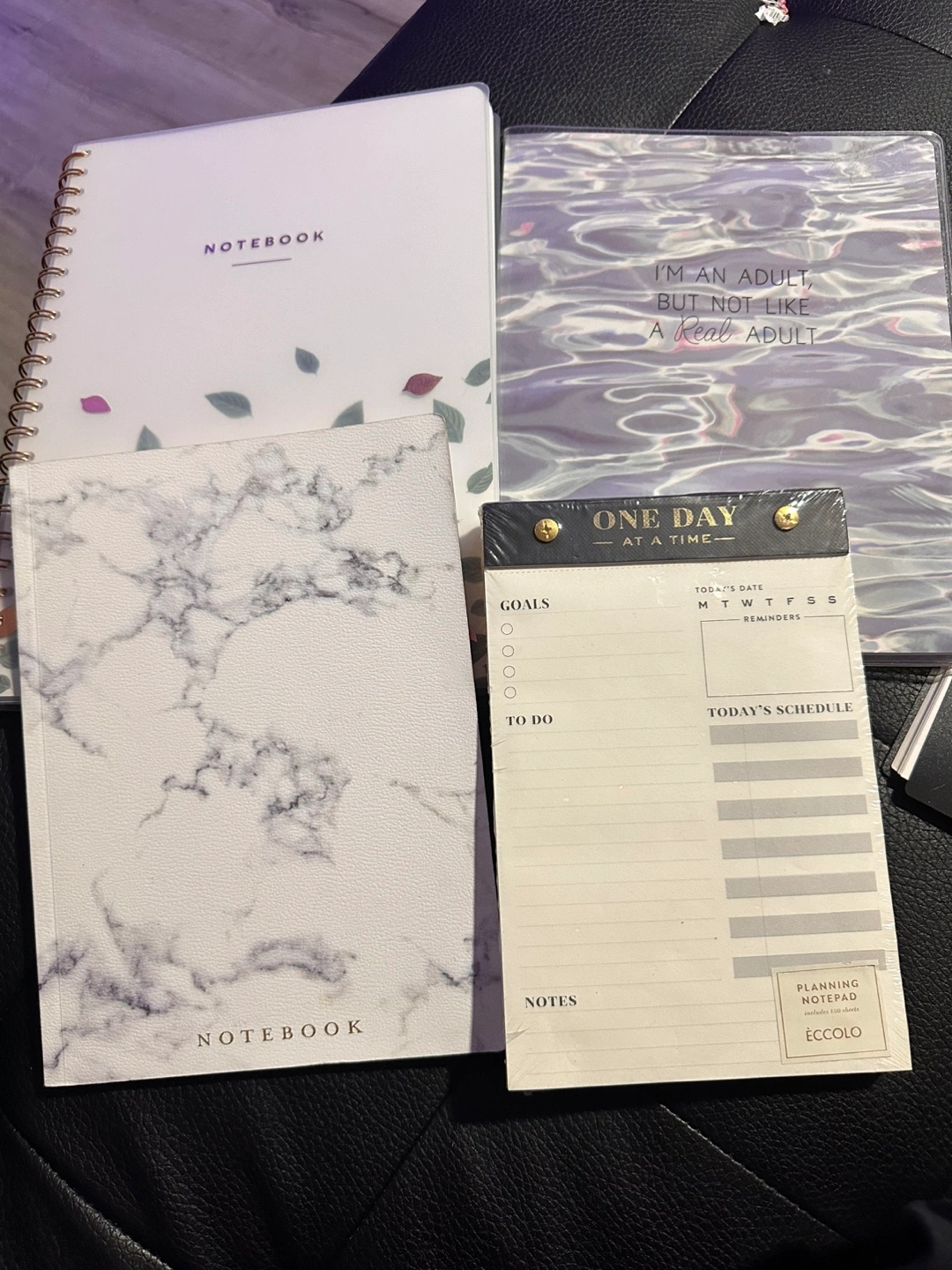 Selling a bundle of notebooks and a planning notepad! Includes: - A notebook with a floral design - A notebook with a marble design - A notepad that says "I'm an adult, but not like a real adult" - An Eccolo 'One Day at a Time' planning notepad with 150 sheets for goals, to-do lists, and notes