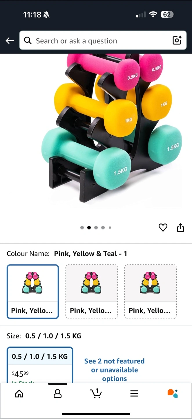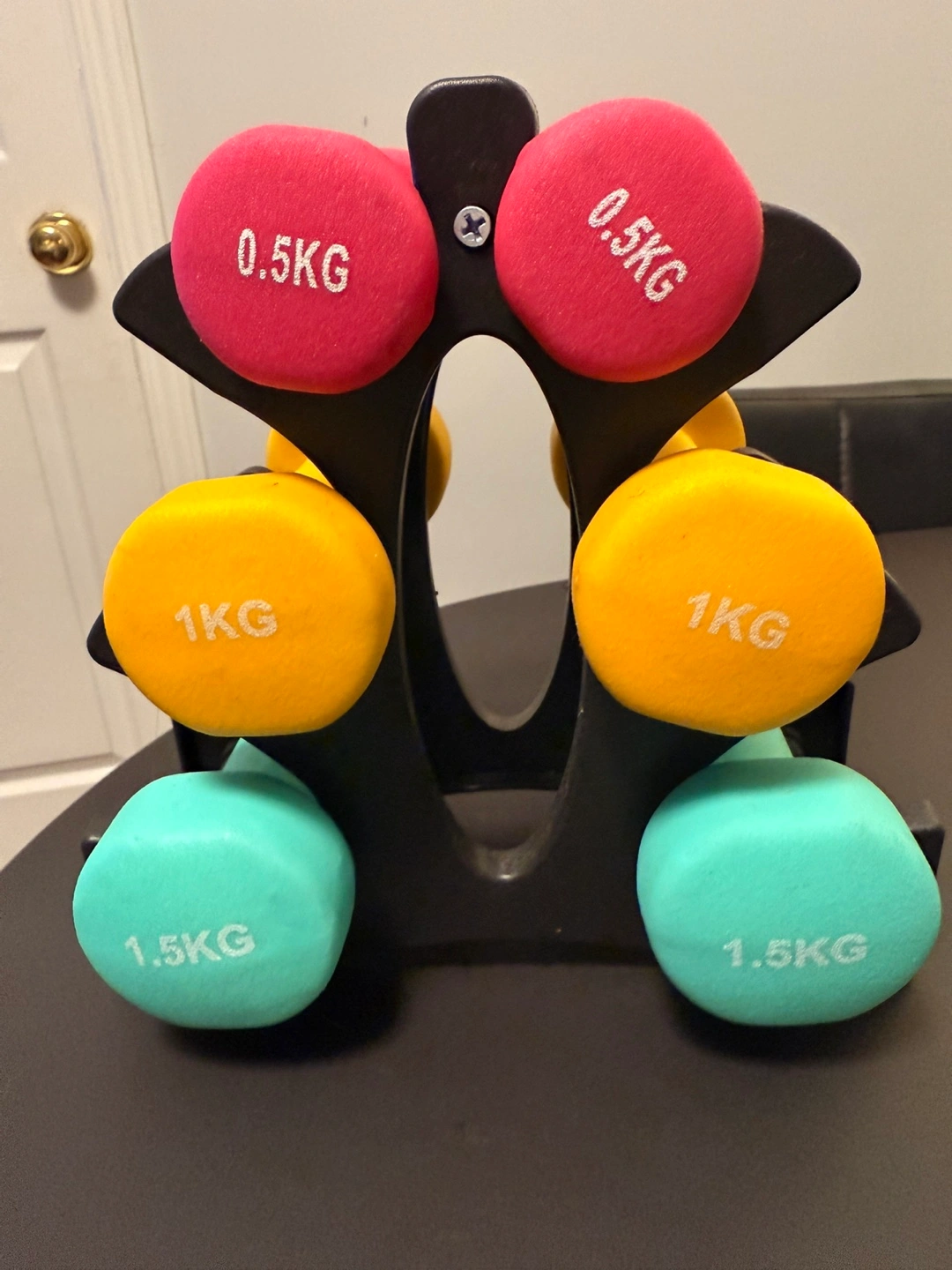 Get your home gym started with this dumbbell set! It includes a rack and three pairs of dumbbells in different weights and fun colours: - Pink: 0.5 KG - Yellow: 1 KG - Teal: 1.5 KG Originally bought for $45.99