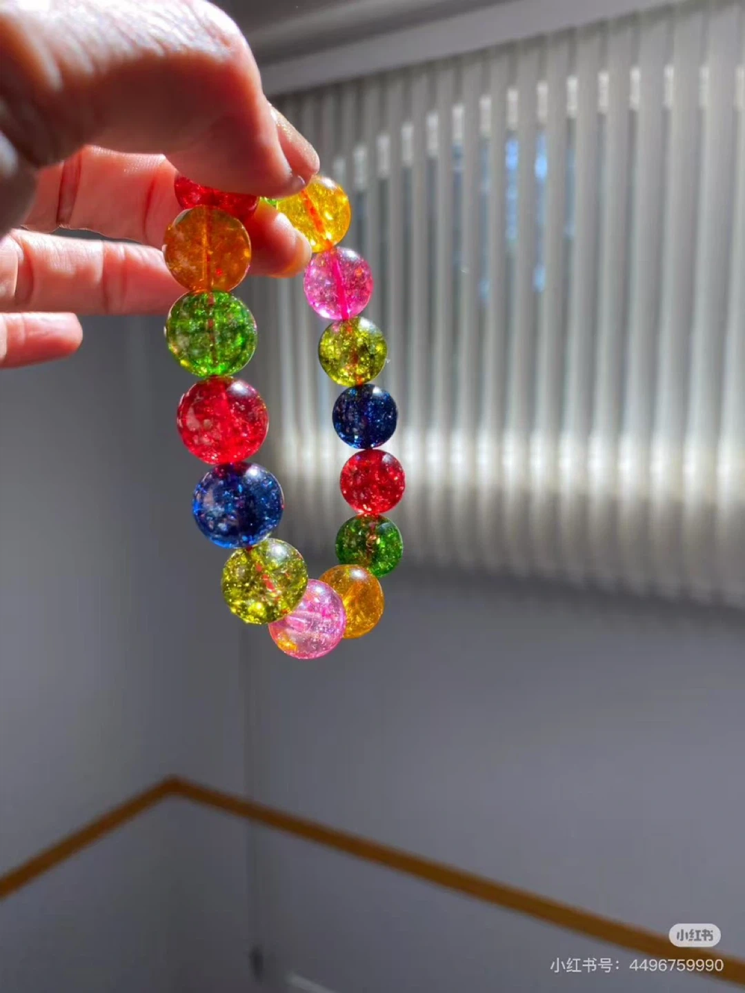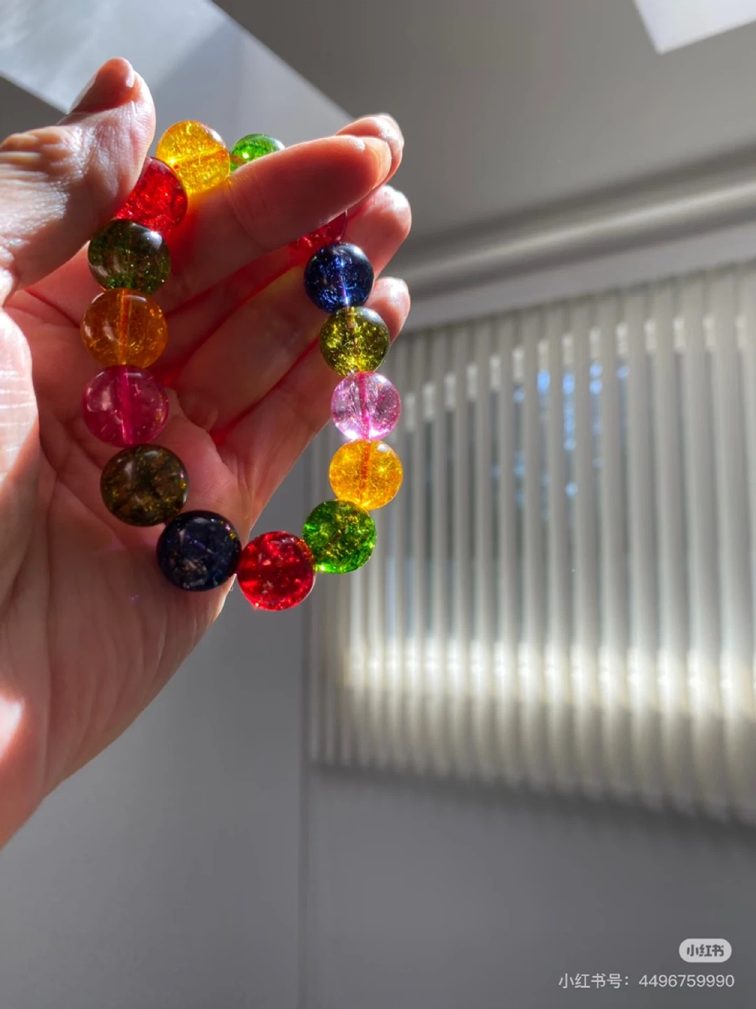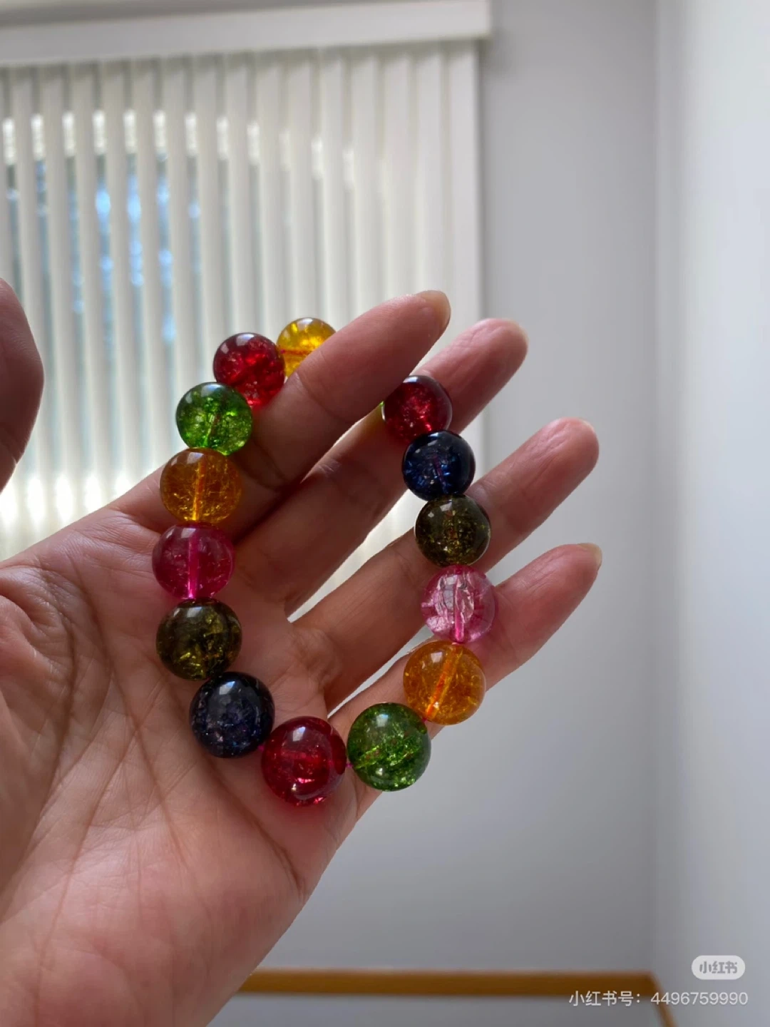 This is a colourful beaded bracelet. It features round beads in various colours.