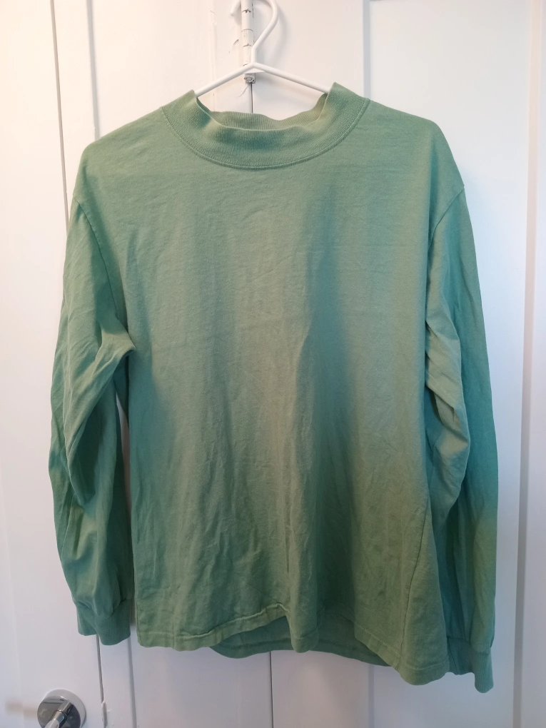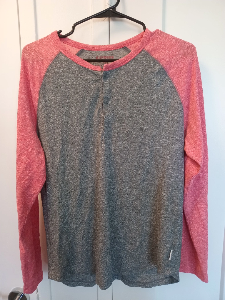 A few long sleeve shirts looking for a new home! Includes a grey and pink baseball tee, a solid green long sleeve, and a grey graphic long sleeve shirt