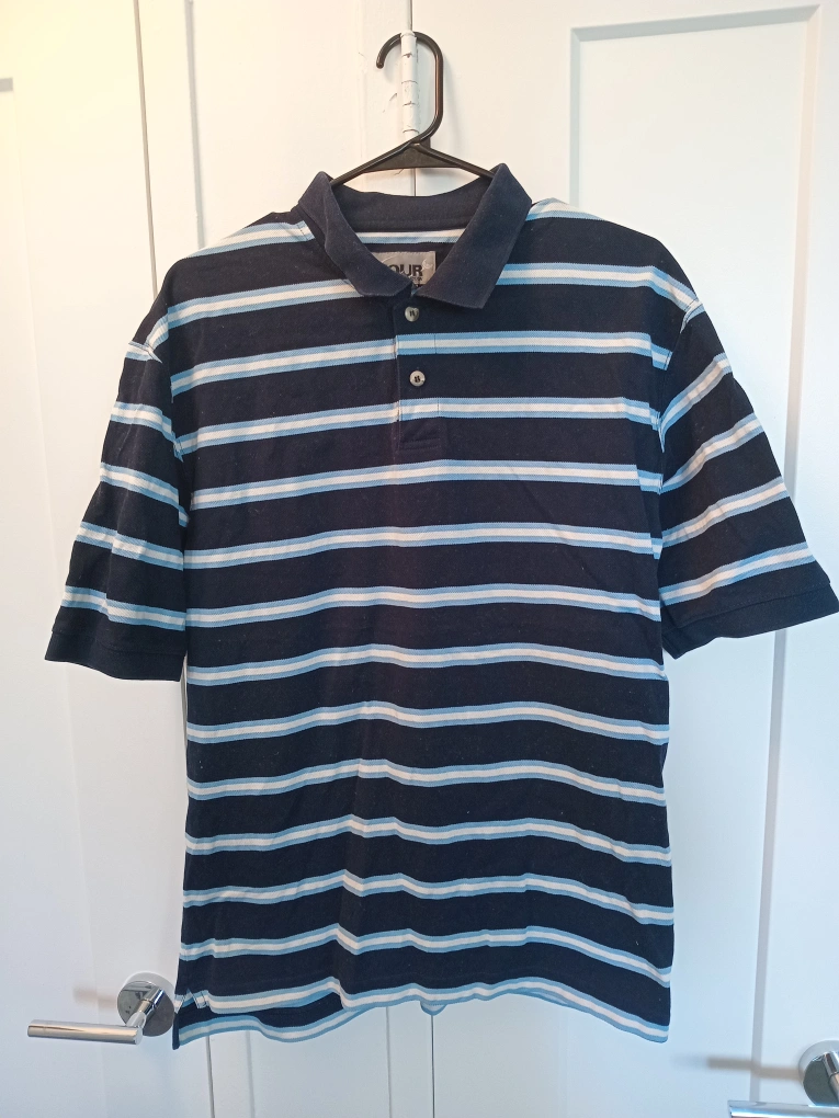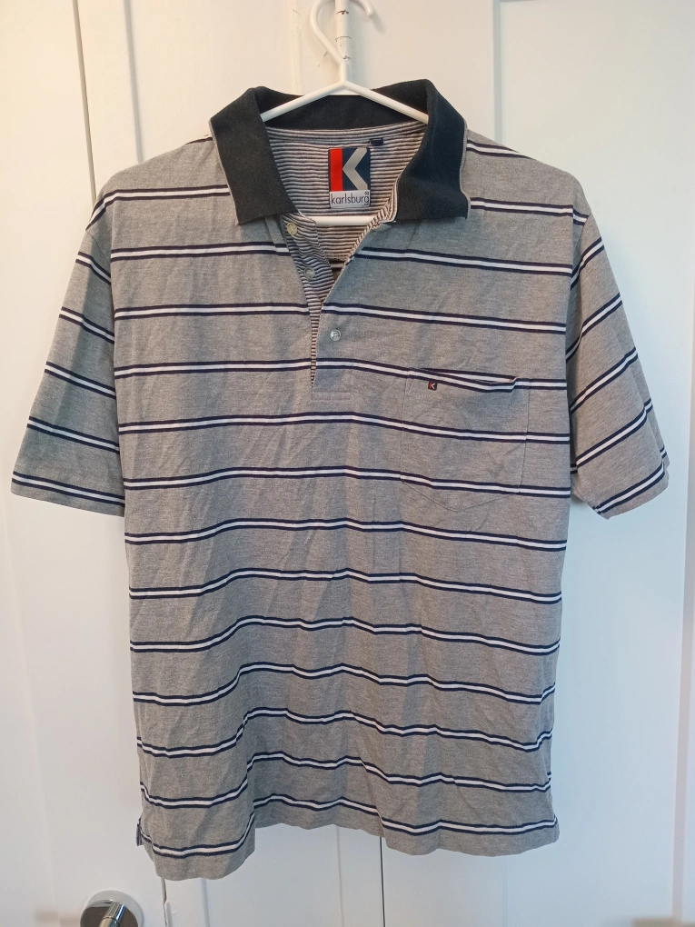 Three Large classic polo design shirts. The shirts features a classic polo design with a striped pattern. It's a comfortable and stylish choice for everyday wear