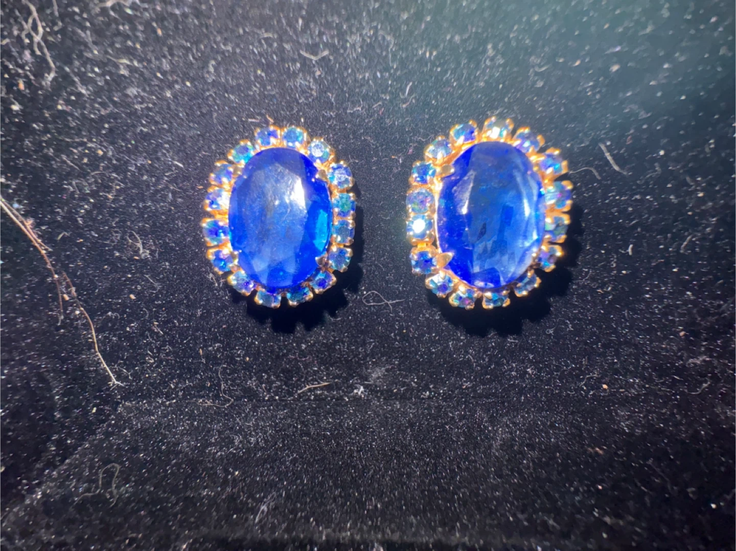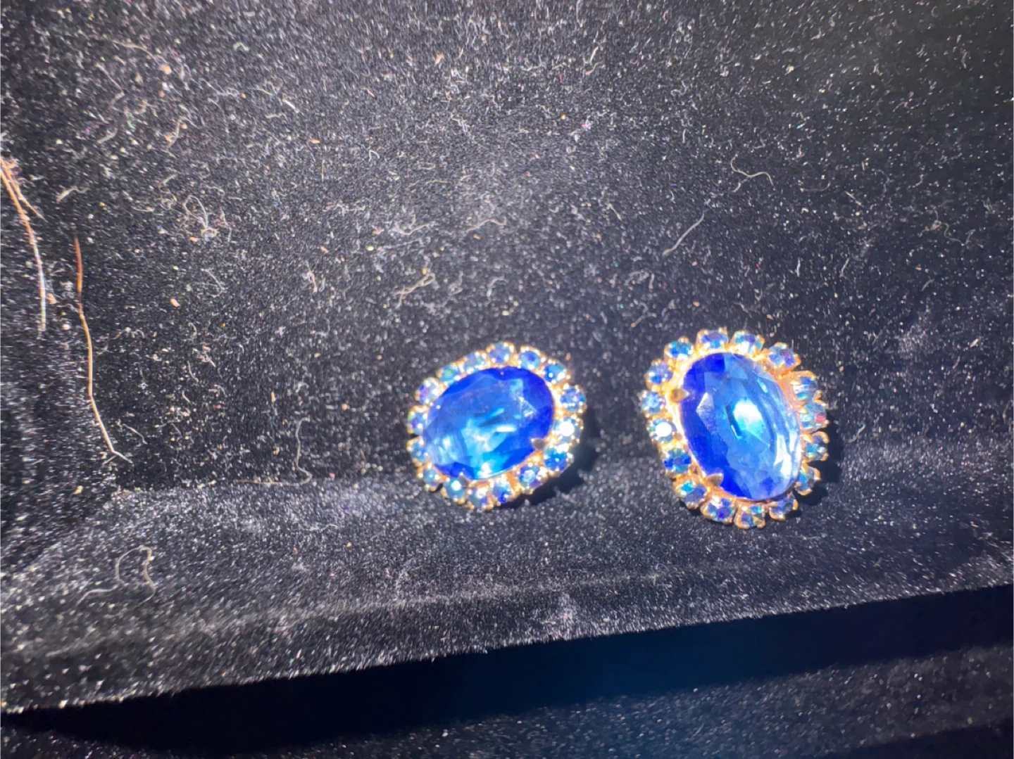 These are a pair of lovely blue stone earrings. They have a gold-tone trim and are in great condition. Perfect for adding a pop of colour to any outfit