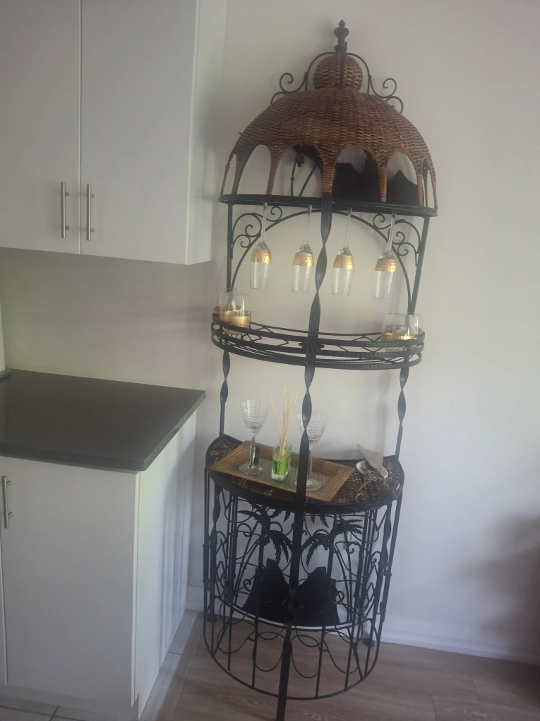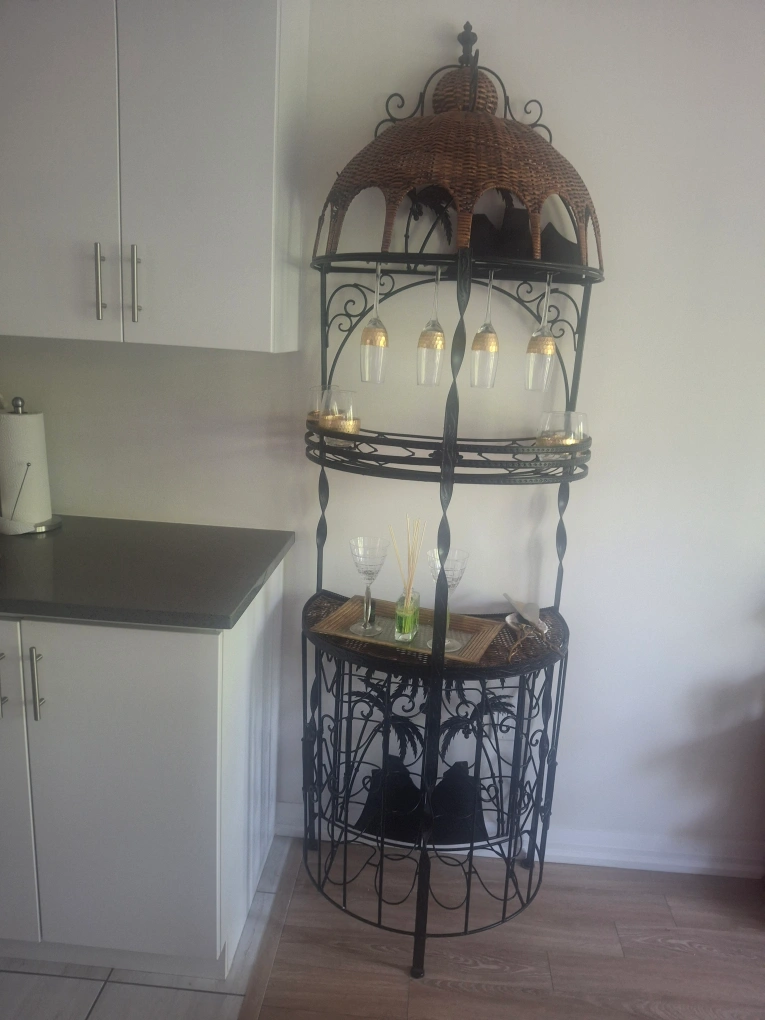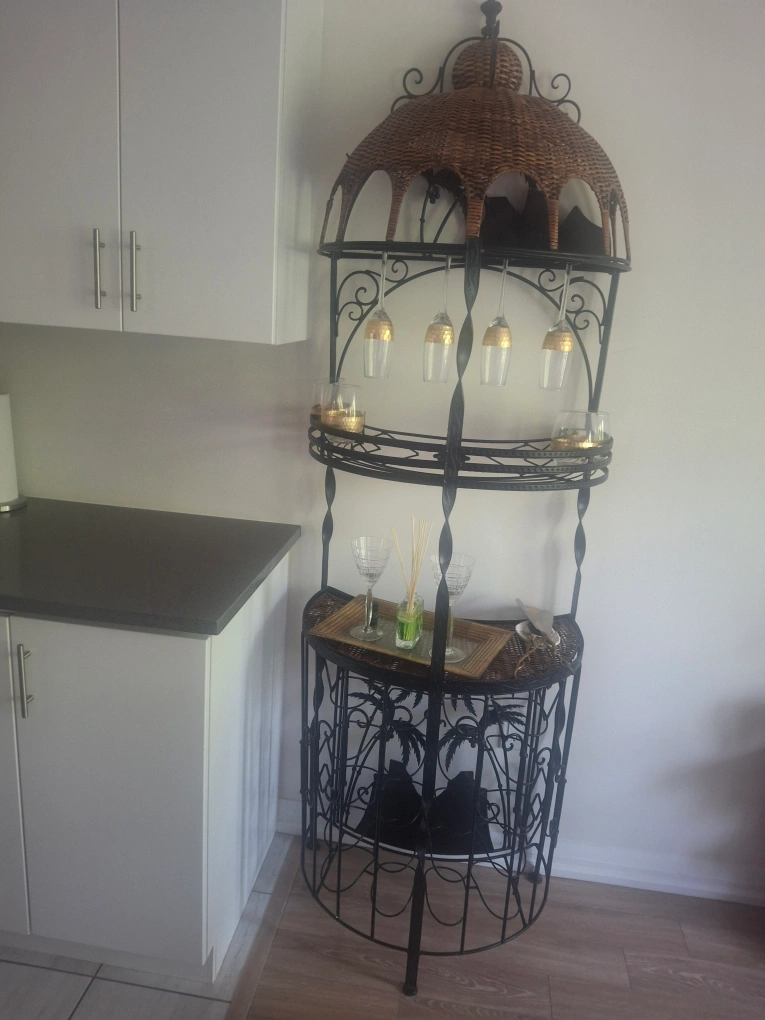 This unique wine rack features a combination of wicker and metal. It's perfect for displaying glassware, candles, or other decorative items. It would be a great addition to any living room or dining area!