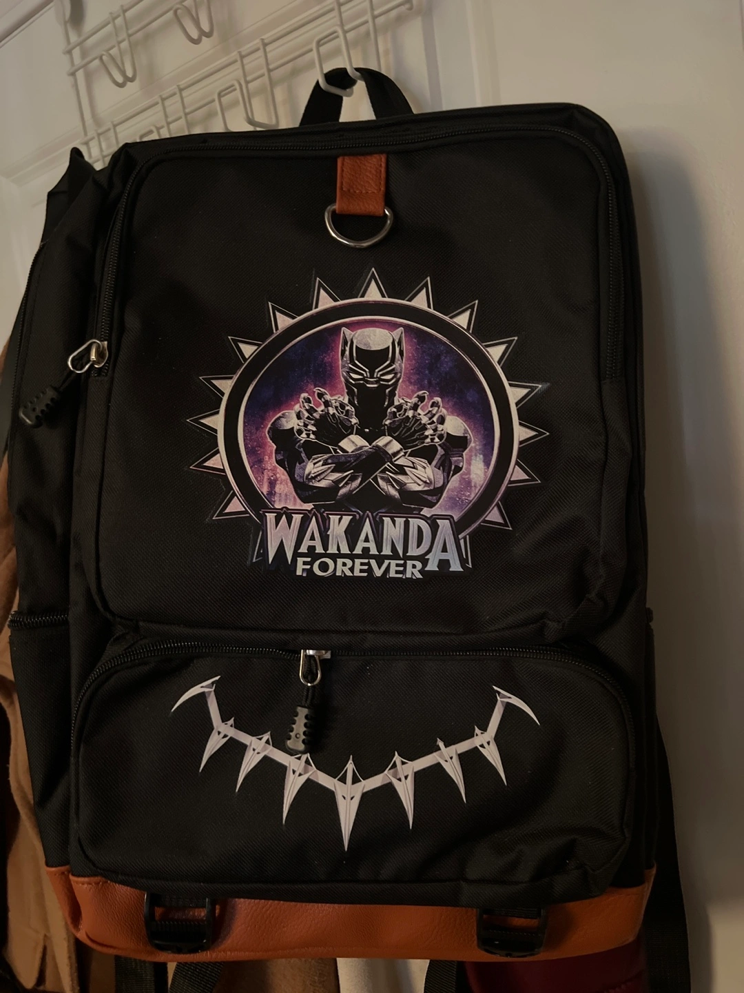 Selling a 'Wakanda Forever' Black Panther themed backpack! It's black with brown accents and features the iconic Black Panther emblem. Perfect for any Marvel fan!