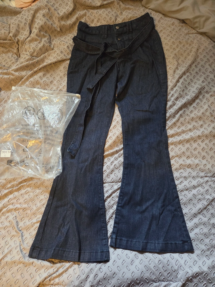 Dark wash flare jeans with a tie belt. Size large. In great condition!