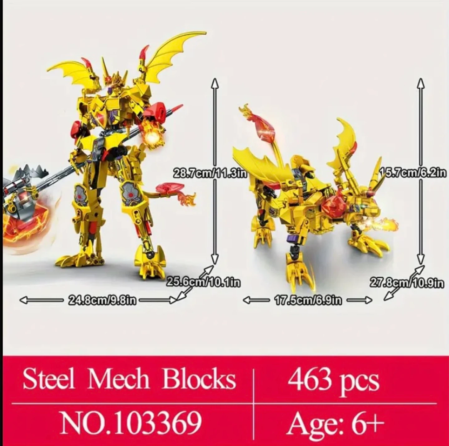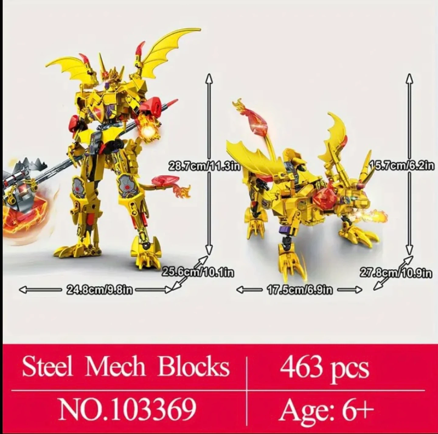 This cool Steel Mech Blocks robot toy is perfect for kids aged 6 and up! It comes with 463 pieces to build a transforming robot and dragon. The robot stands at 28.7cm/11.3in tall, while the dragon measures 15.7cm/6.2in. Hours of fun await!