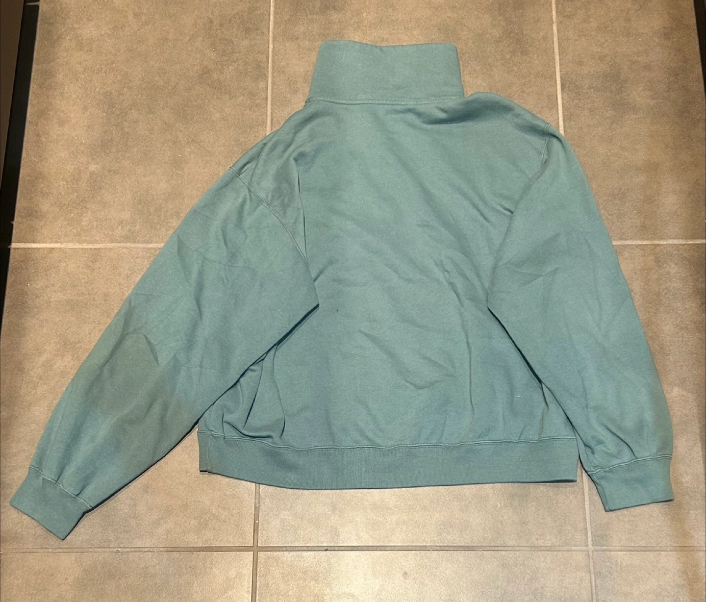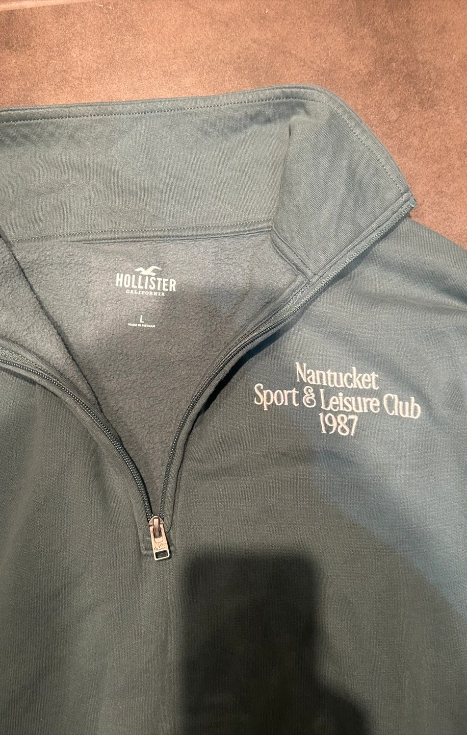 Cozy Hollister 1/4 zip sweatshirt in a lovely green colour. It's a size large and features the 'Nantucket Sport & Leisure Club 1987' design on the front. Perfect for staying warm and stylish!