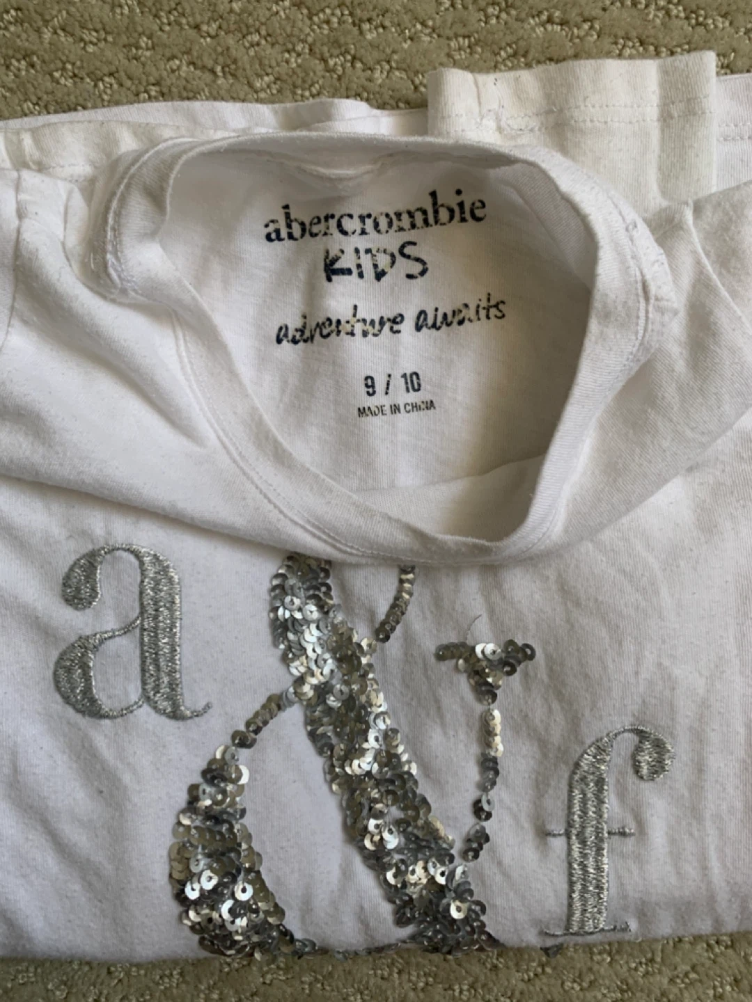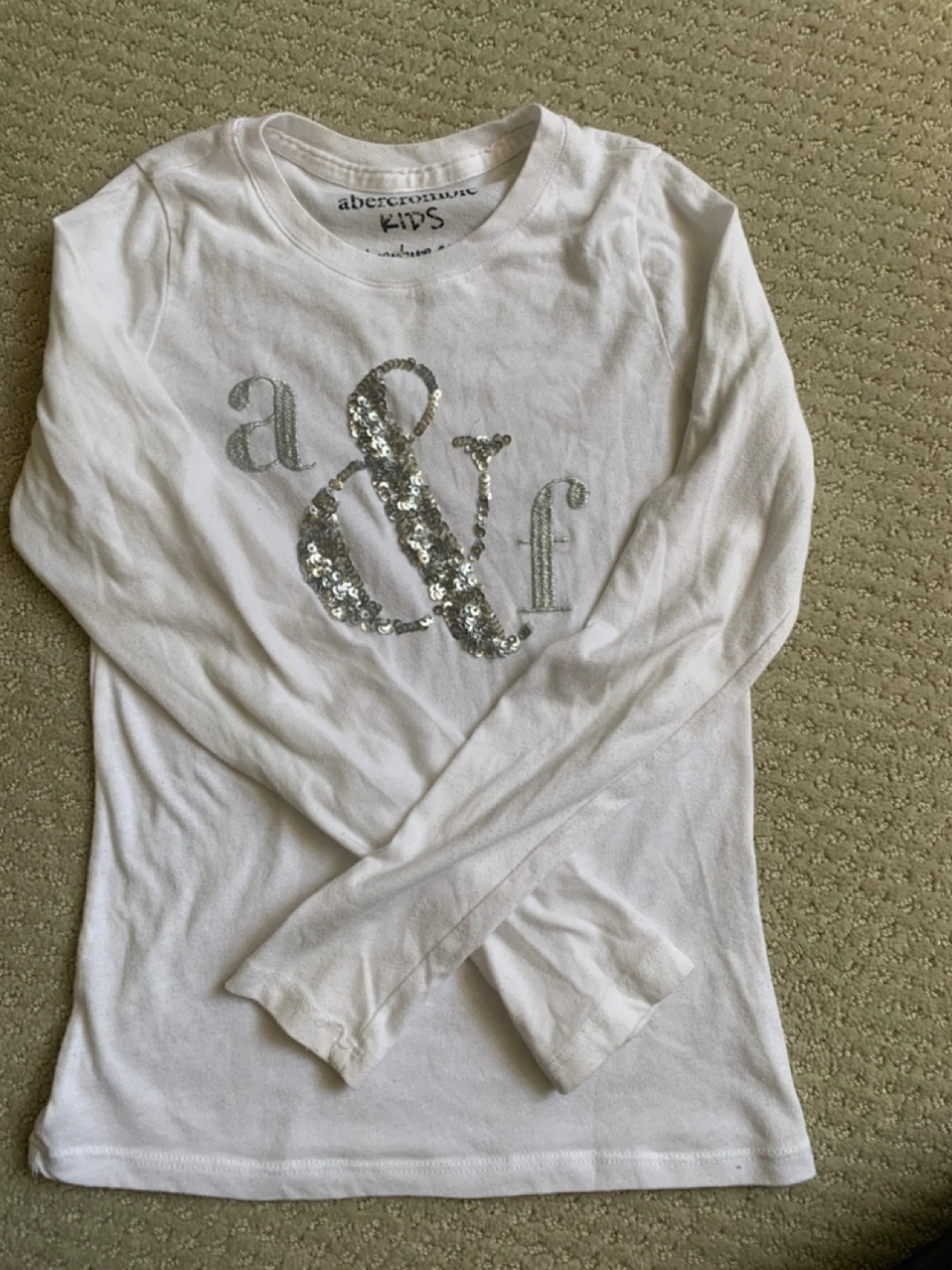 I'm selling an Abercrombie Kids long-sleeve top in size 9/10. It's white with a sparkly silver 'a&f' design on the front. Perfect for your little one!