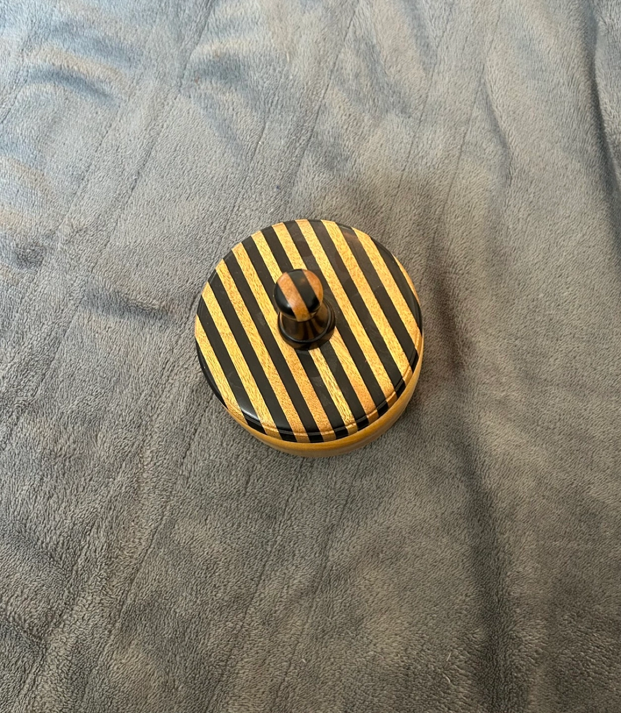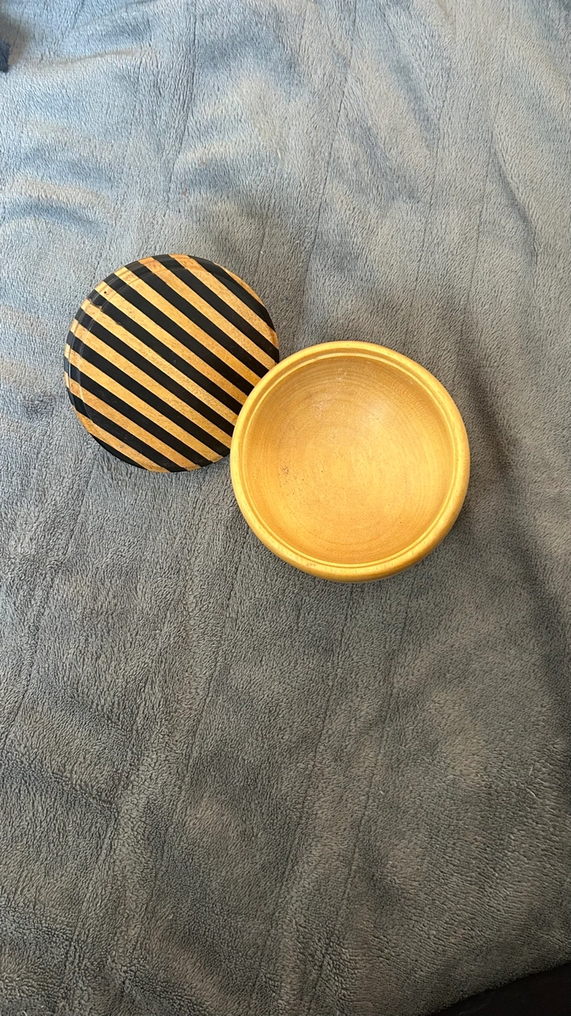 Selling a cute wooden bowl with a striped lid. It's in great shape and would look lovely on a shelf or table. Perfect for storing small items or just as a decorative piece!