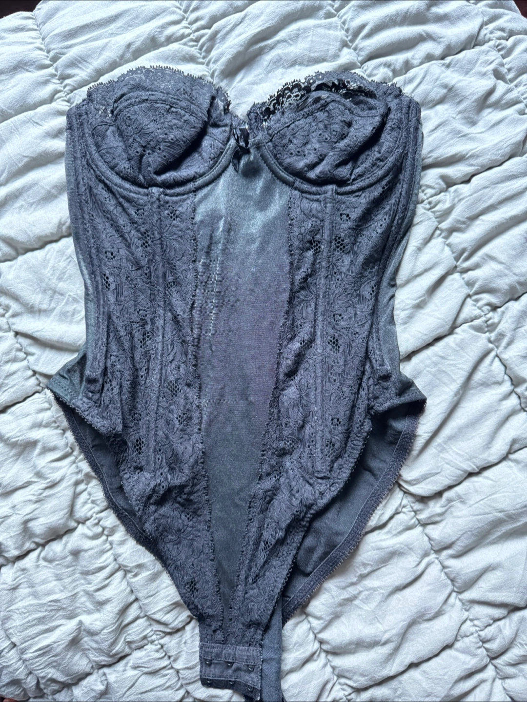 Black bustier/corset bodysuit, definitely on the small or extra small side with the cup size being around a A