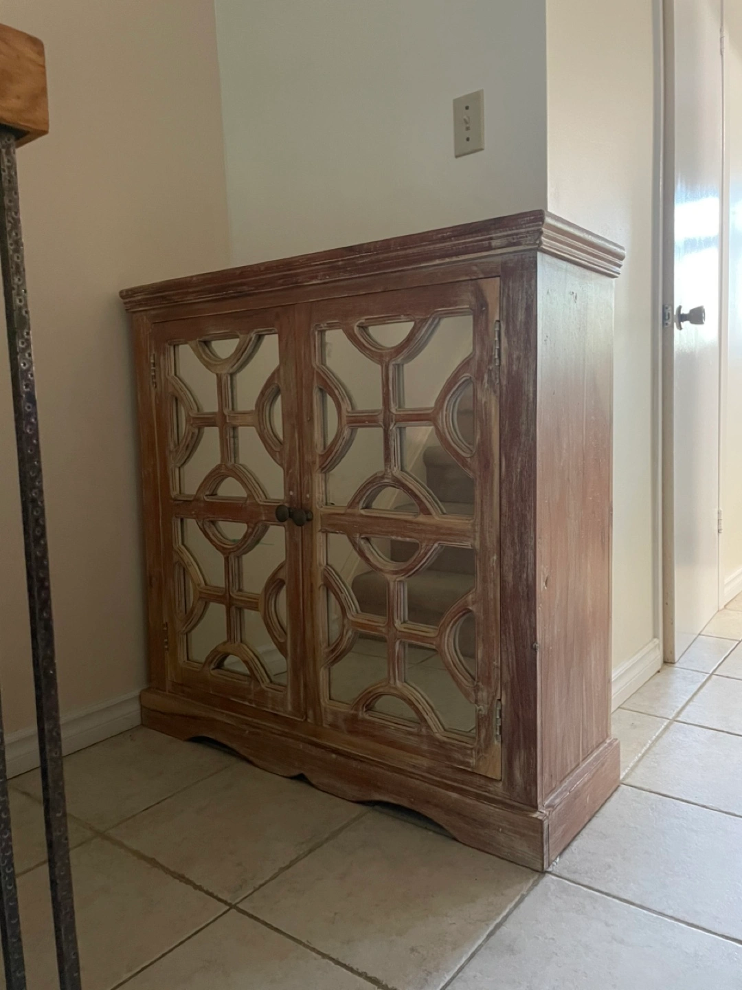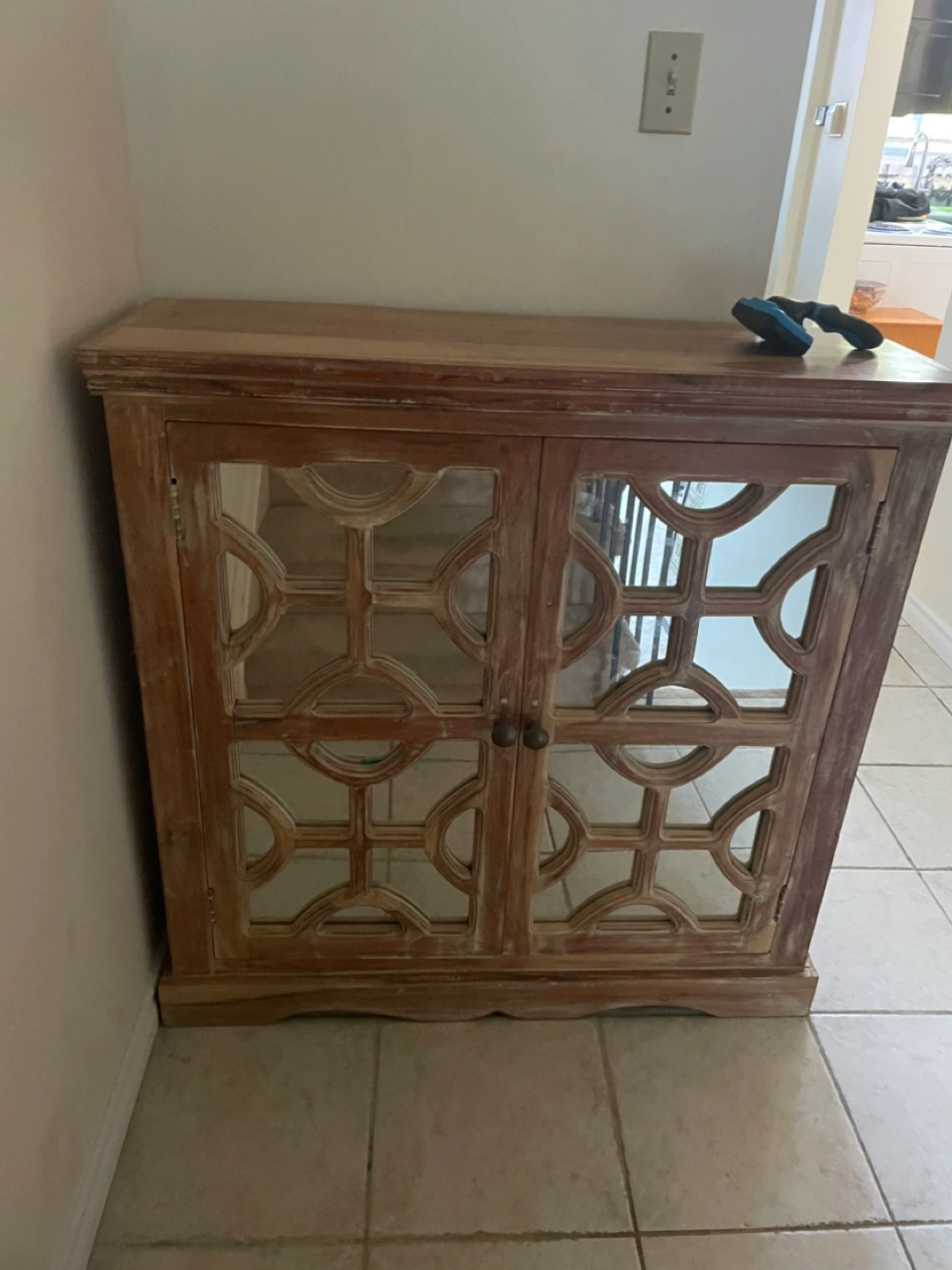 Here's a charming wooden cabinet with mirrored doors! It's perfect for adding a touch of elegance to any room. The cabinet features a lovely design and provides practical storage space. It would look great in a hallway, living room, or even a bedroom. It's in good condition and ready for a new home