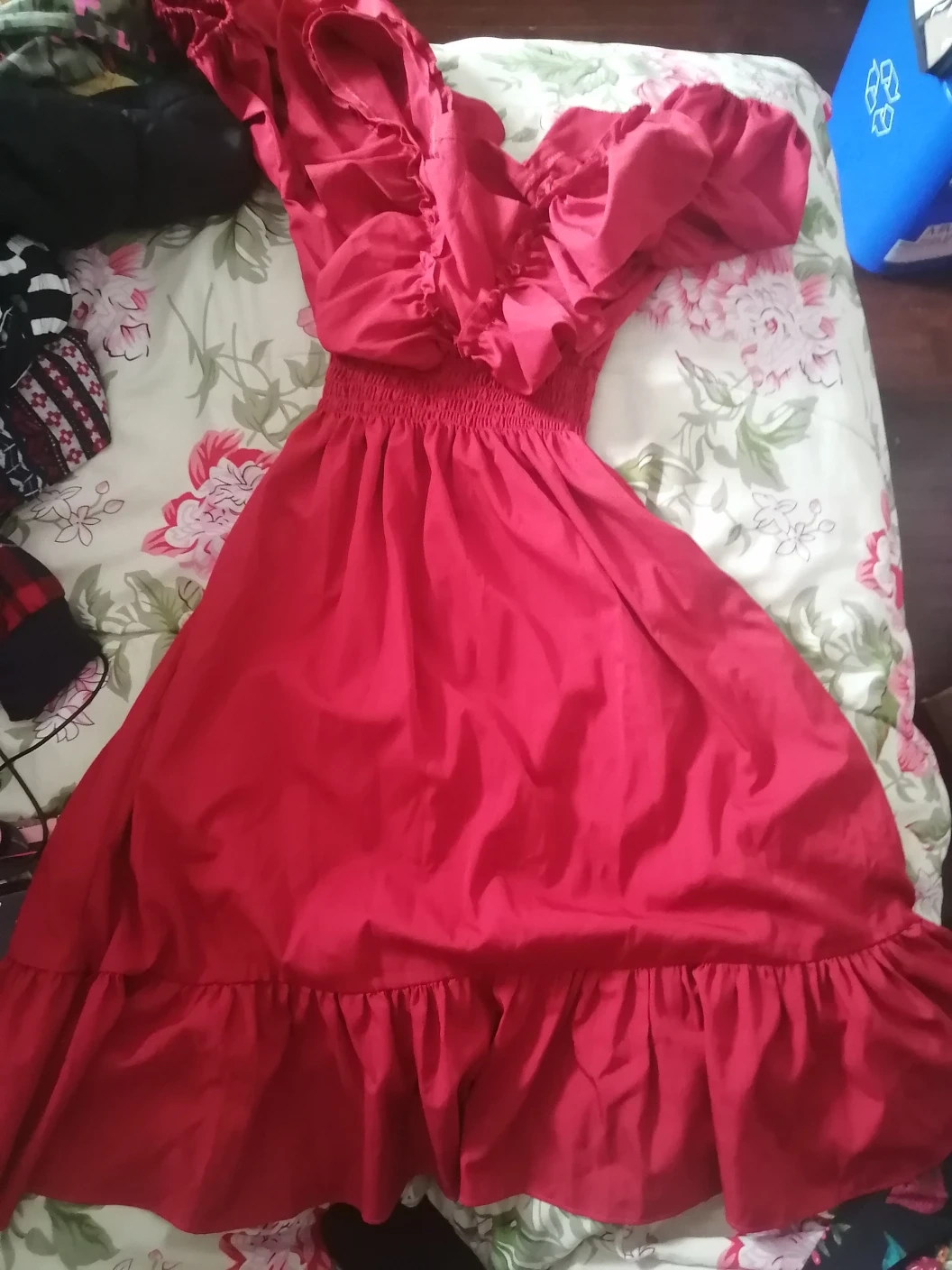 Brand New, and never worn. A beautiful red dress with ruffled detailing. It has a fitted bodice and a flowing skirt. Perfect for a special occasion or a night out.