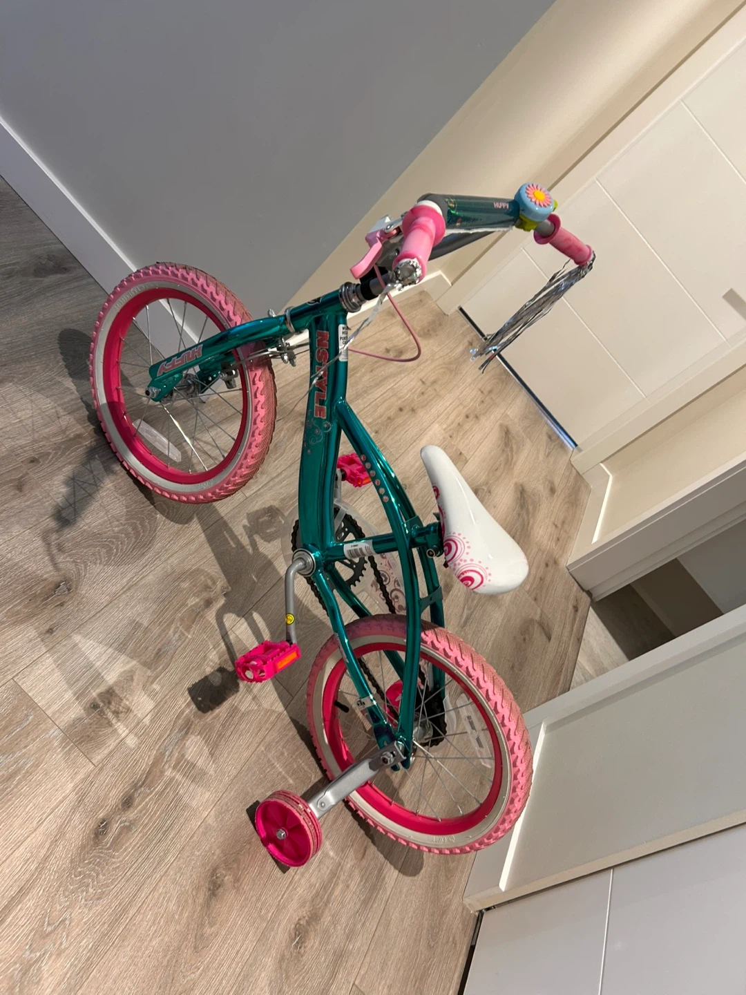 Selling a Huffy girls' bicycle in great condition! It features a vibrant teal frame with pink accents, perfect for young riders. It's a 16-inch bike, suitable for kids learning to ride. It also has training wheels.