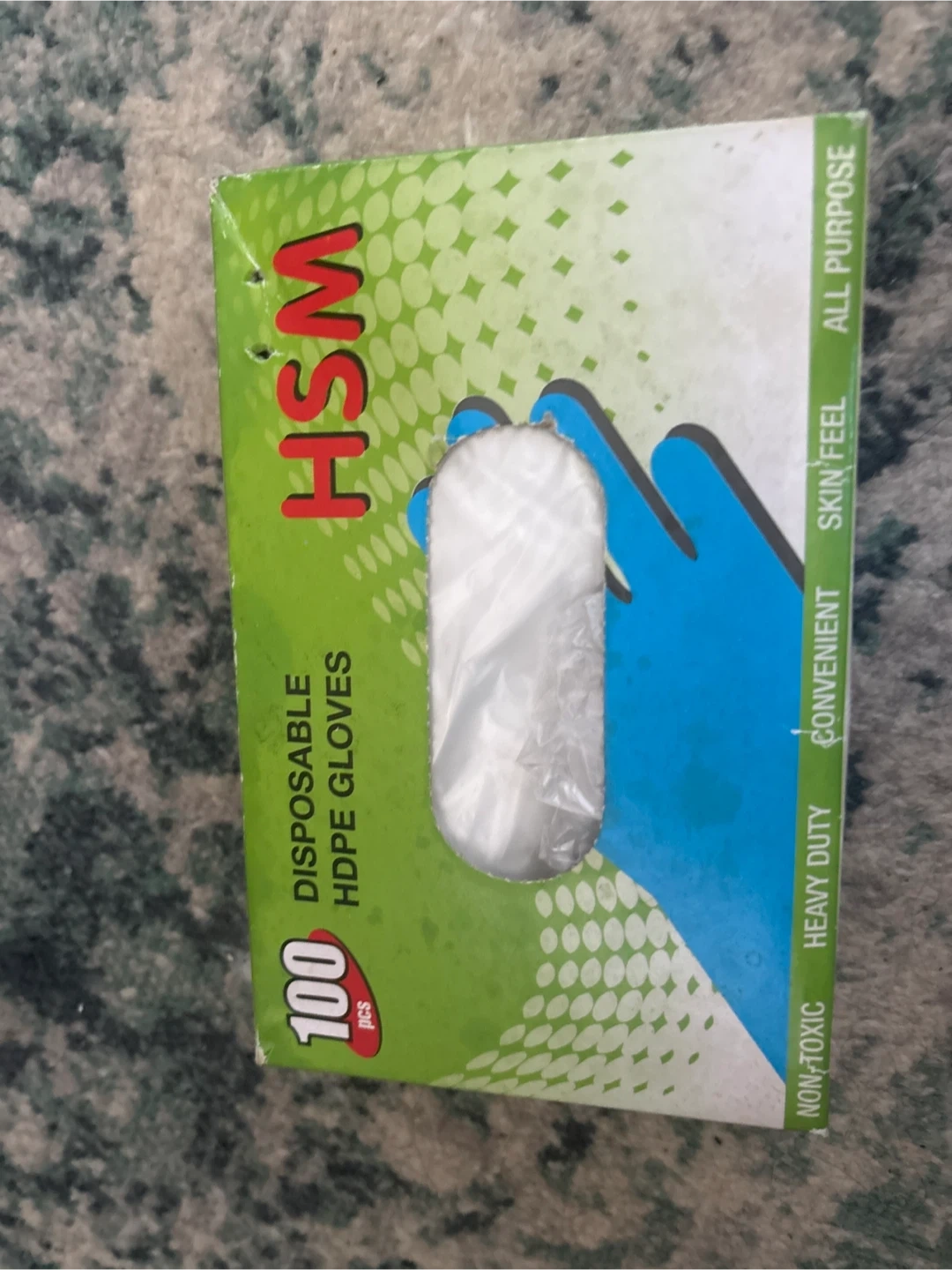 Selling a box of HSM disposable HDPE gloves! This box contains almost 90 pieces. They are all-purpose, skin-feel, convenient, heavy duty, and non-toxic