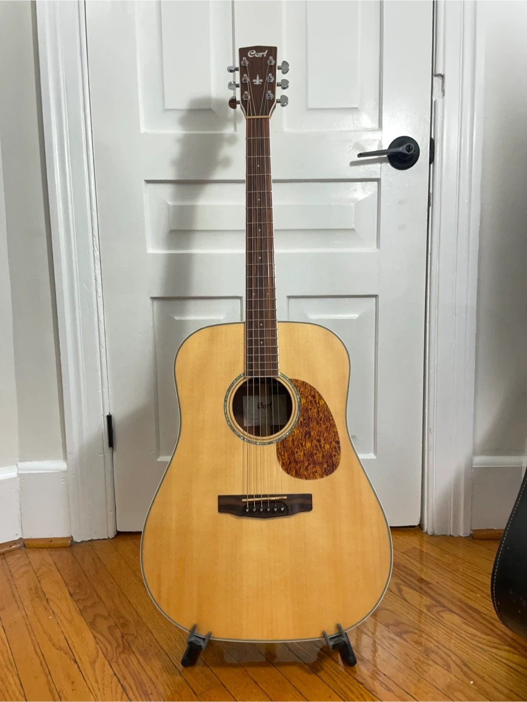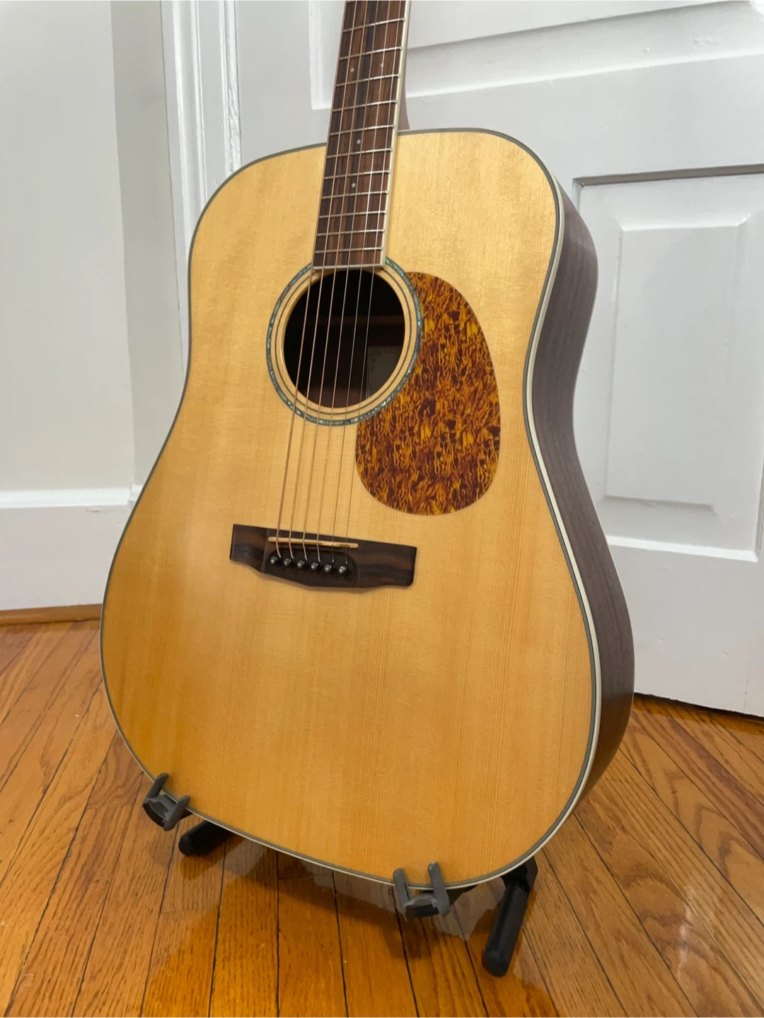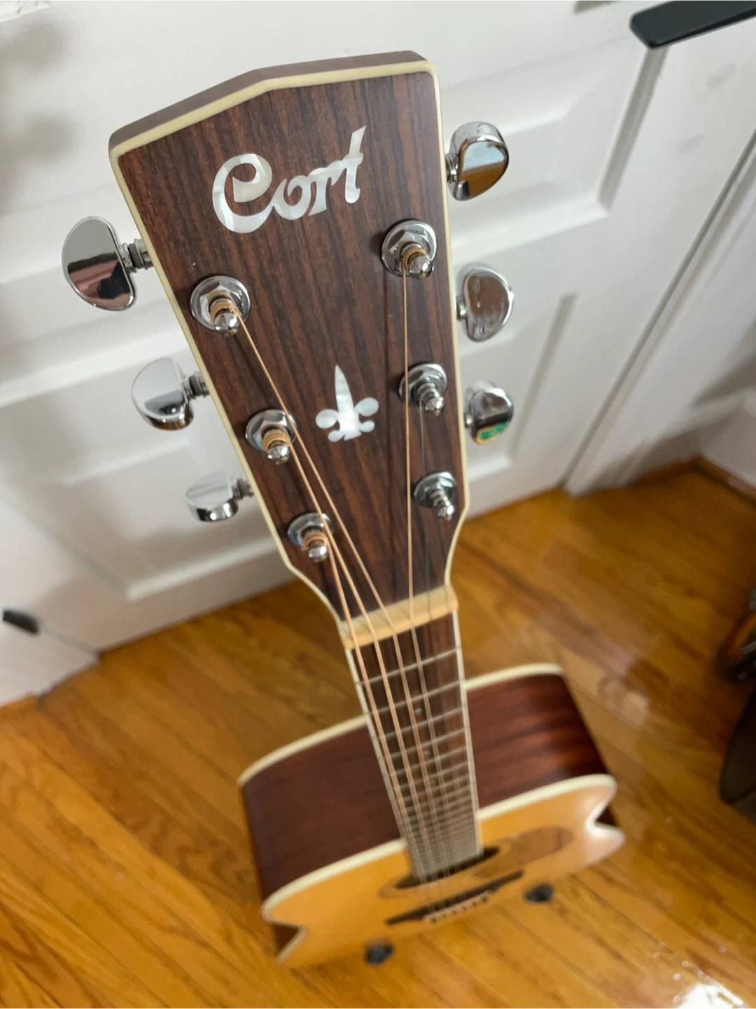 A stunning and wonderfully maintained guitar, appointed with features typically found on much more expensive instruments. Solid spruce top Solid Mahogany back and sides Rosewood fingerboard and bridge Grover Tuners Neck volute Abalone rosette Satin finish The guitar has got a great big sound to it, and is a breeze to play. Just setup it's sporting new D'Addario 13 gauge phosphor bronze strings, with low, easy playing string height. Comes with a great Cort Deluxe Soft-Side Case. Pickup near Dundas West TTC station.