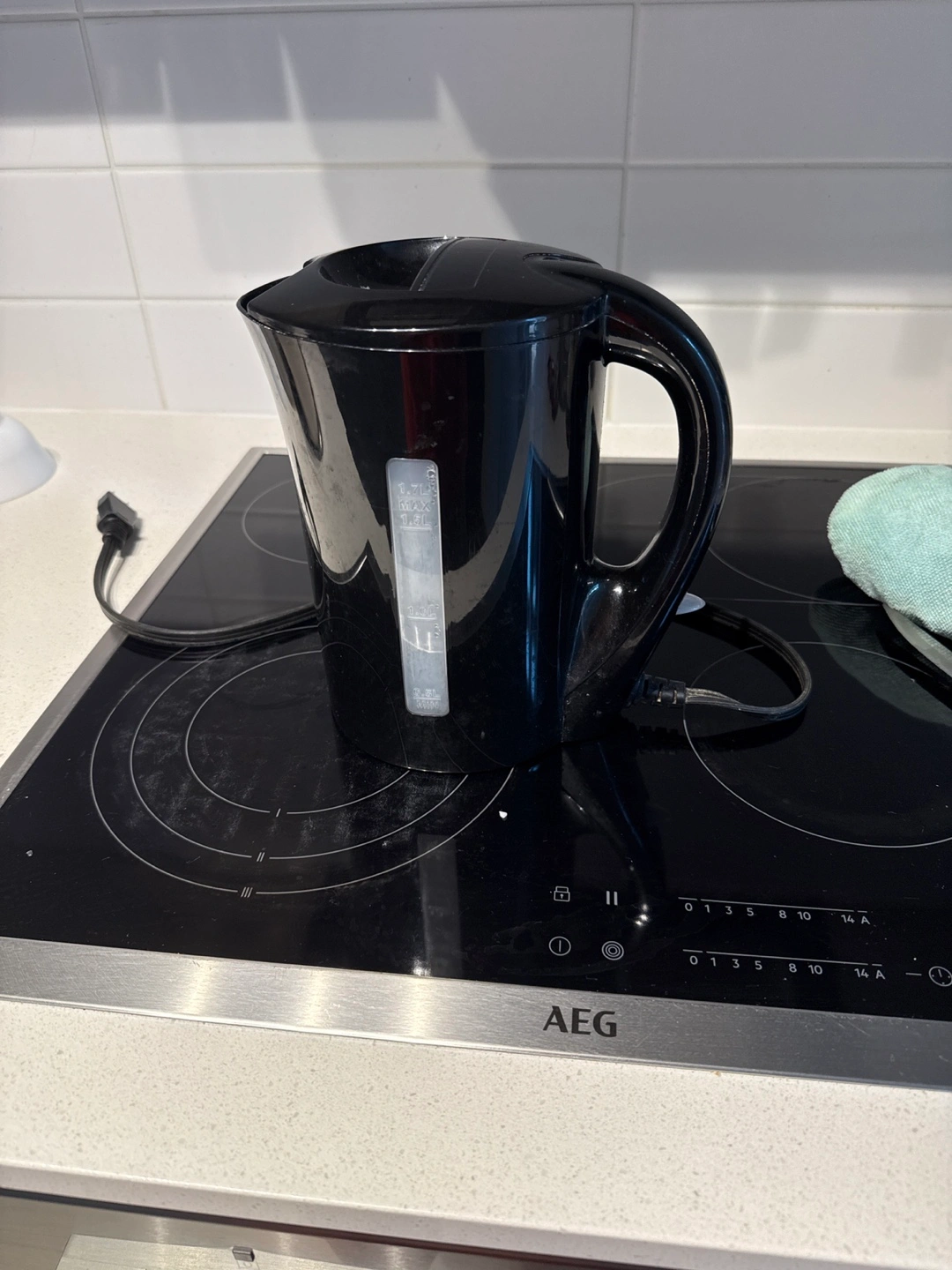 Selling a black electric kettle with a 1.7L maximum capacity. It's in good condition and ready to boil water for your tea or coffee! The kettle is black and has a clear water level indicator on the side.