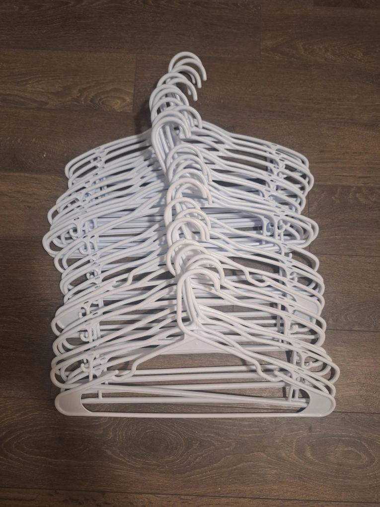 A set of 20 white plastic clothes hangers, perfect for keeping your closet organized! Great for shirts, pants, and more. They're in good condition and ready for a new home
