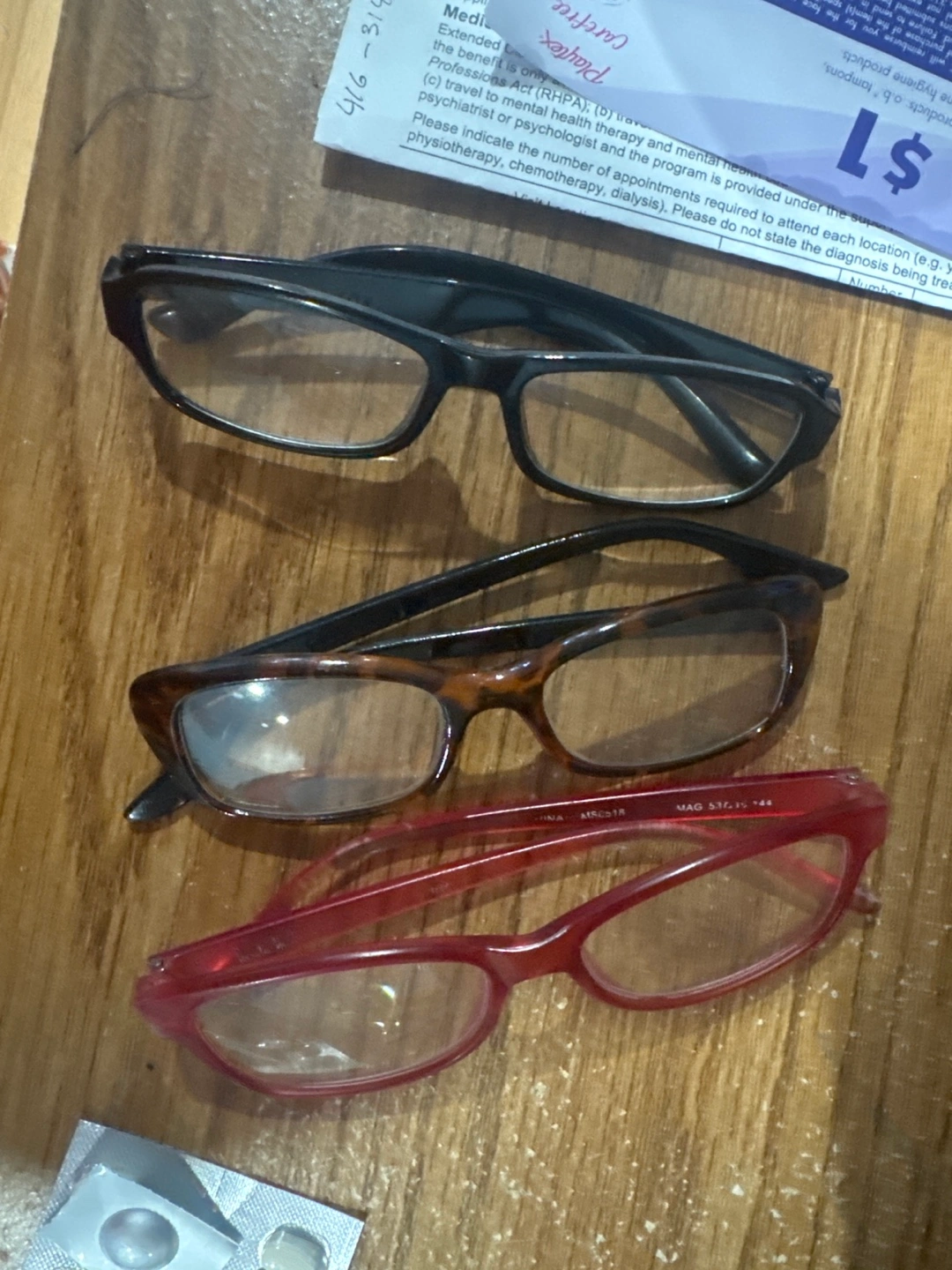 a lot of three pairs of eyeglasses. One black, one tortoiseshell, and one red. From dolarama. 1.50 (eyesight number) Pick up for free Scarborough golf club rd n Lawrence Reading eyeglasses. Hopefully will add more