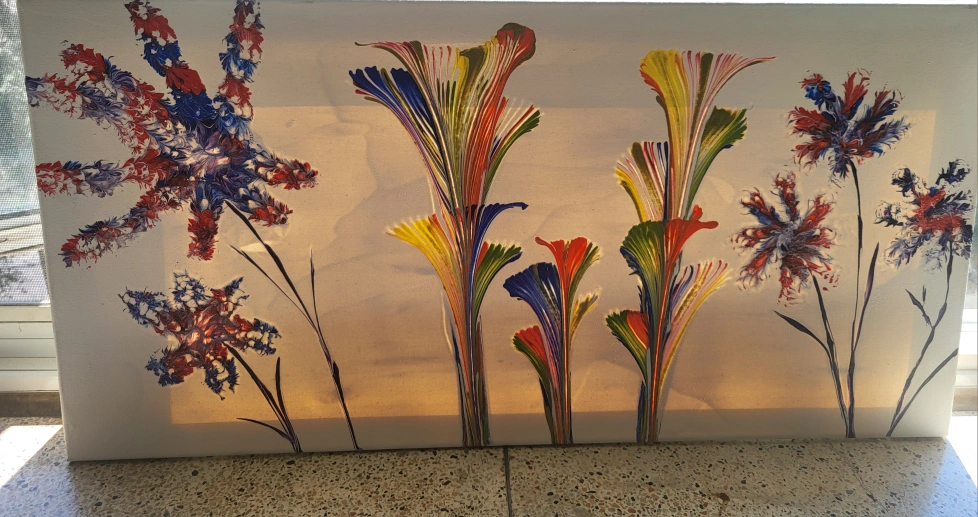This is a beautiful floral acrylic pour painting on canvas! The vibrant colours and unique design make it a standout piece. It would look great in any room