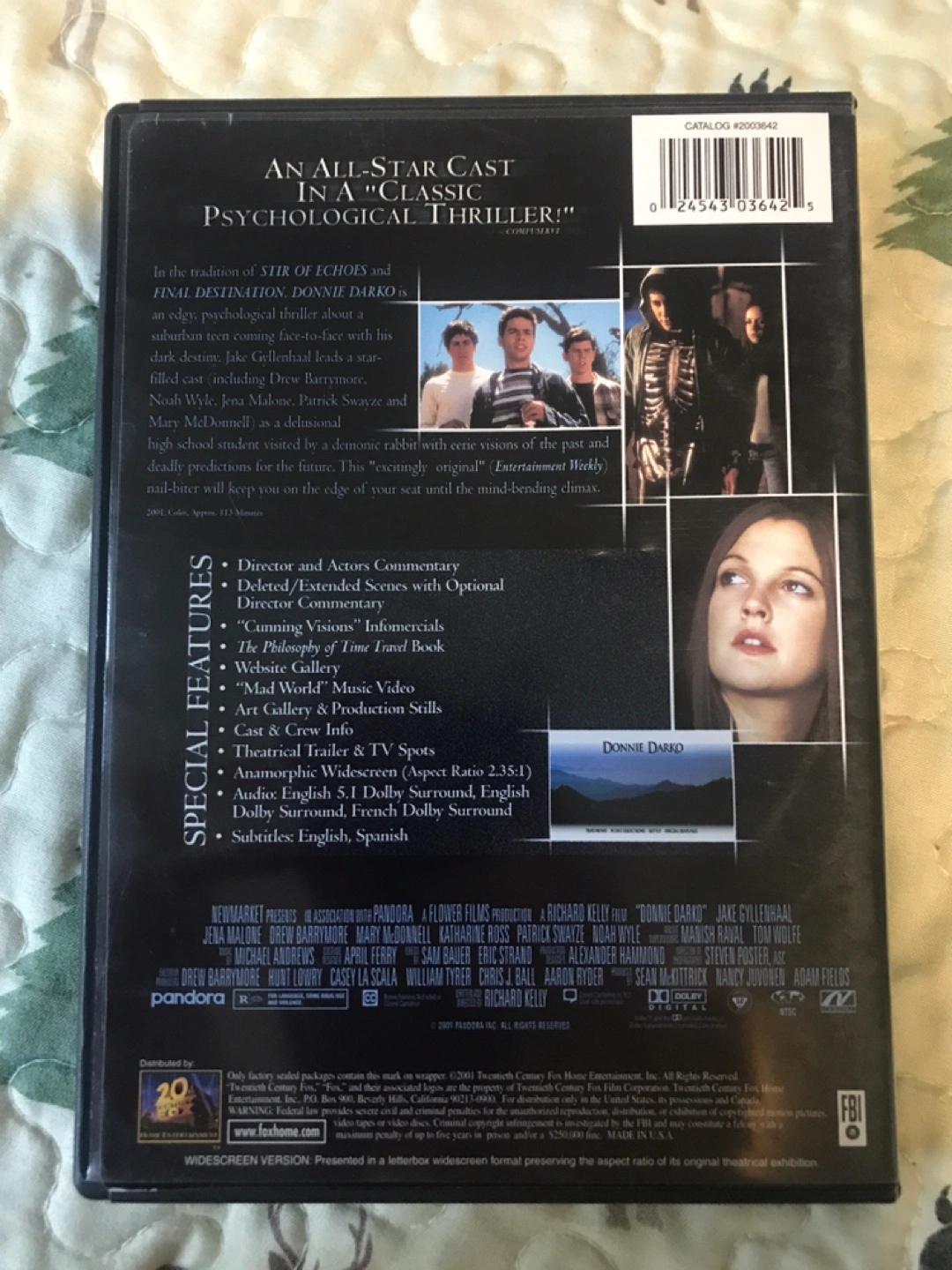 Selling the Donnie Darko DVD. It's an all-star cast in a "Classic Psychological Thriller!" Special features include Director and Actors Commentary, Deleted/Extended Scenes with Optional Director Commentary, and more!