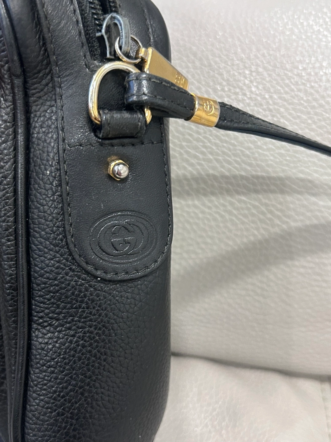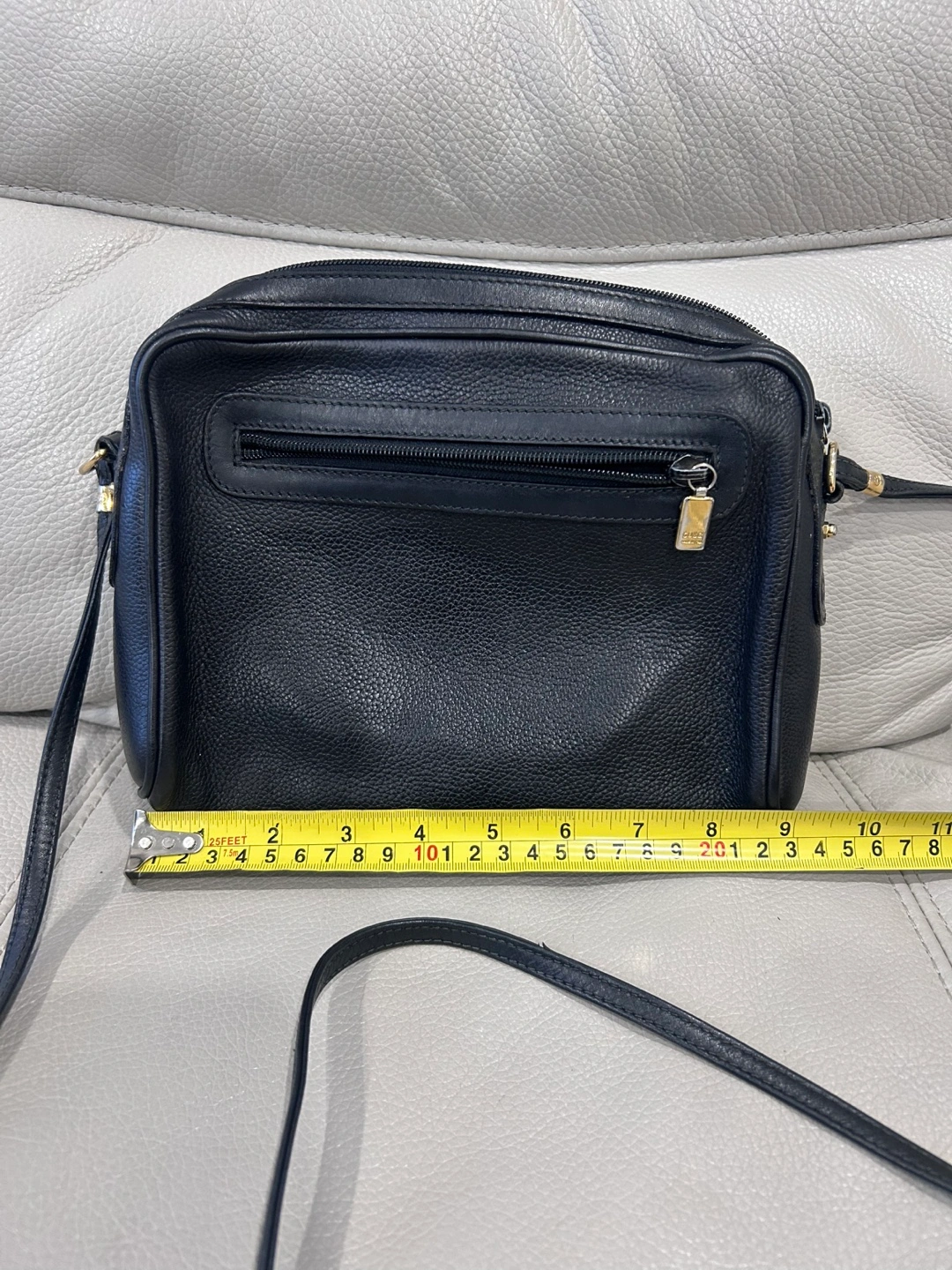 This is a classic Gucci vintage crossbody bag in black leather. It's in great shape and the perfect size for everyday use. The bag measures approximately 9 inches in height and 10 inches in length.