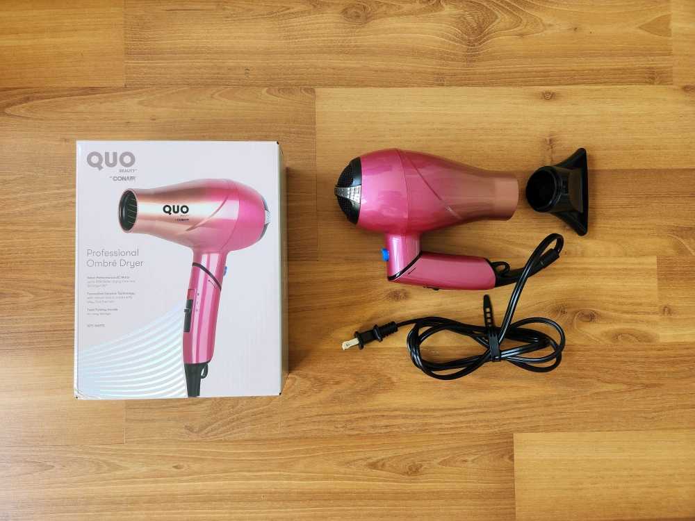 Selling a QUO Beauty Professional Ombré Dryer in pink! It features a salon performance AC motor designed to last 2x longer and Thermaline Ceramic Technology. It also has a twin folding handle for easy storage. The box is included, along with the concentrator attachment