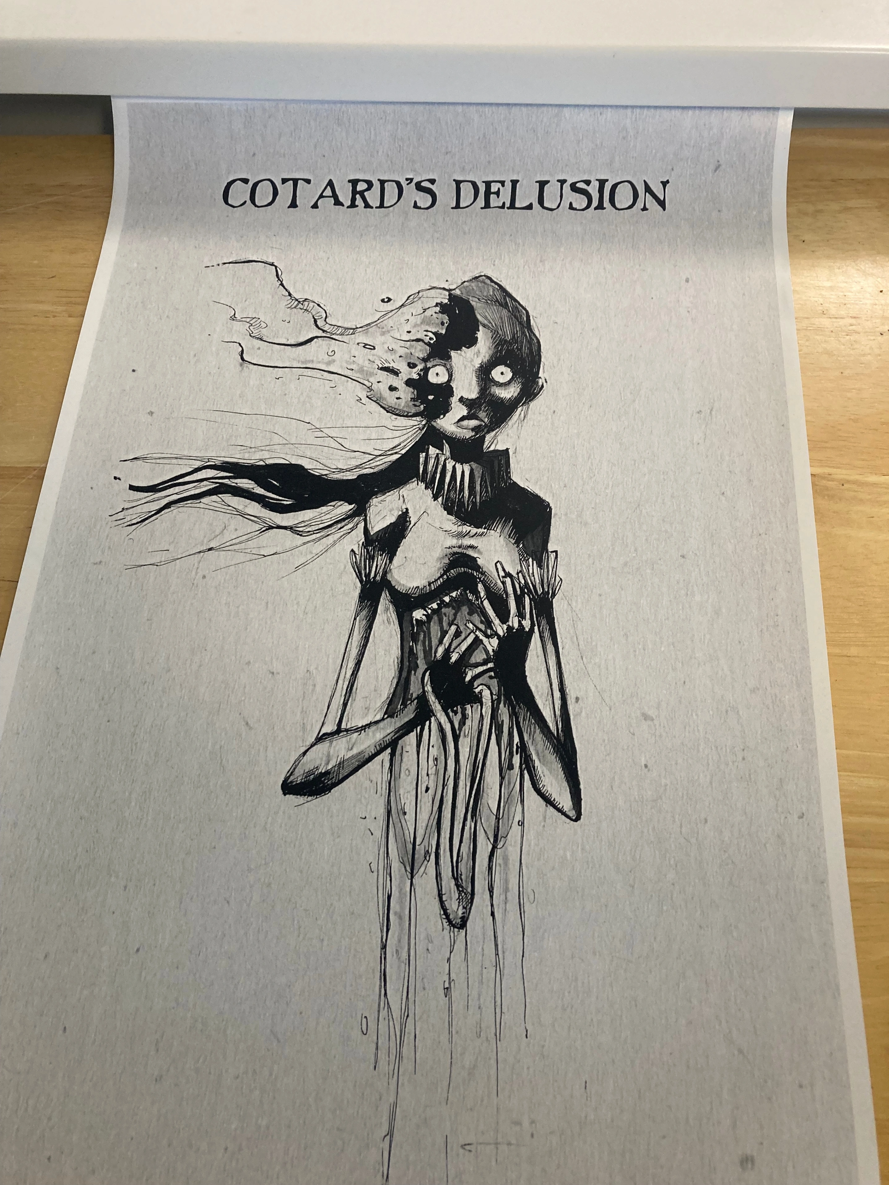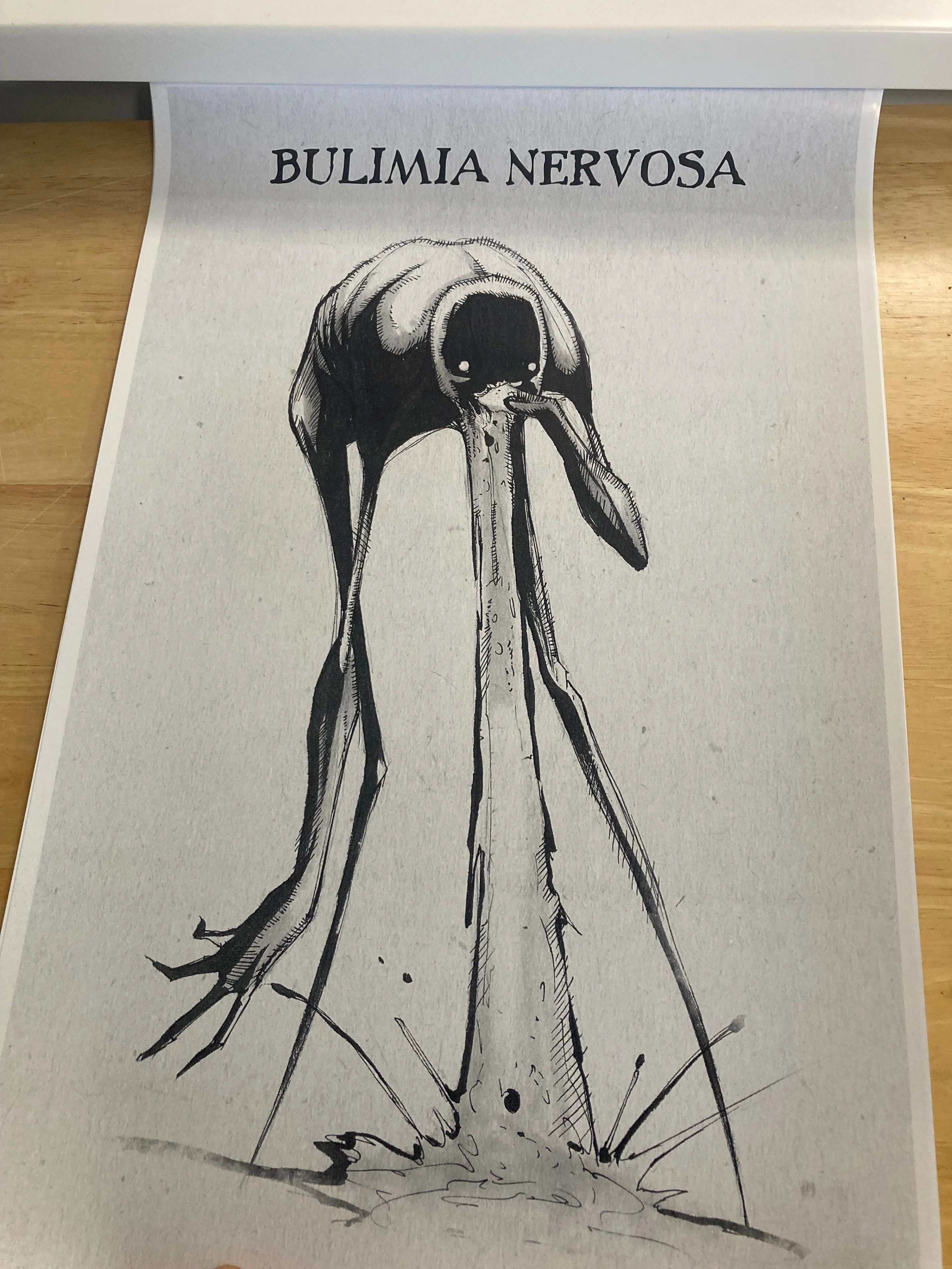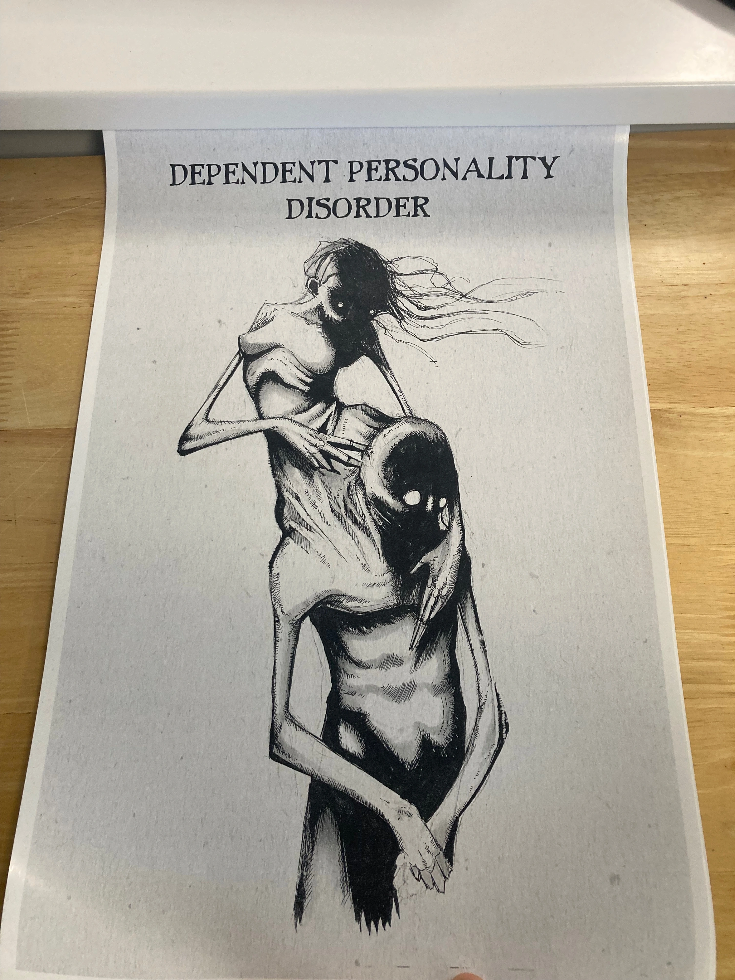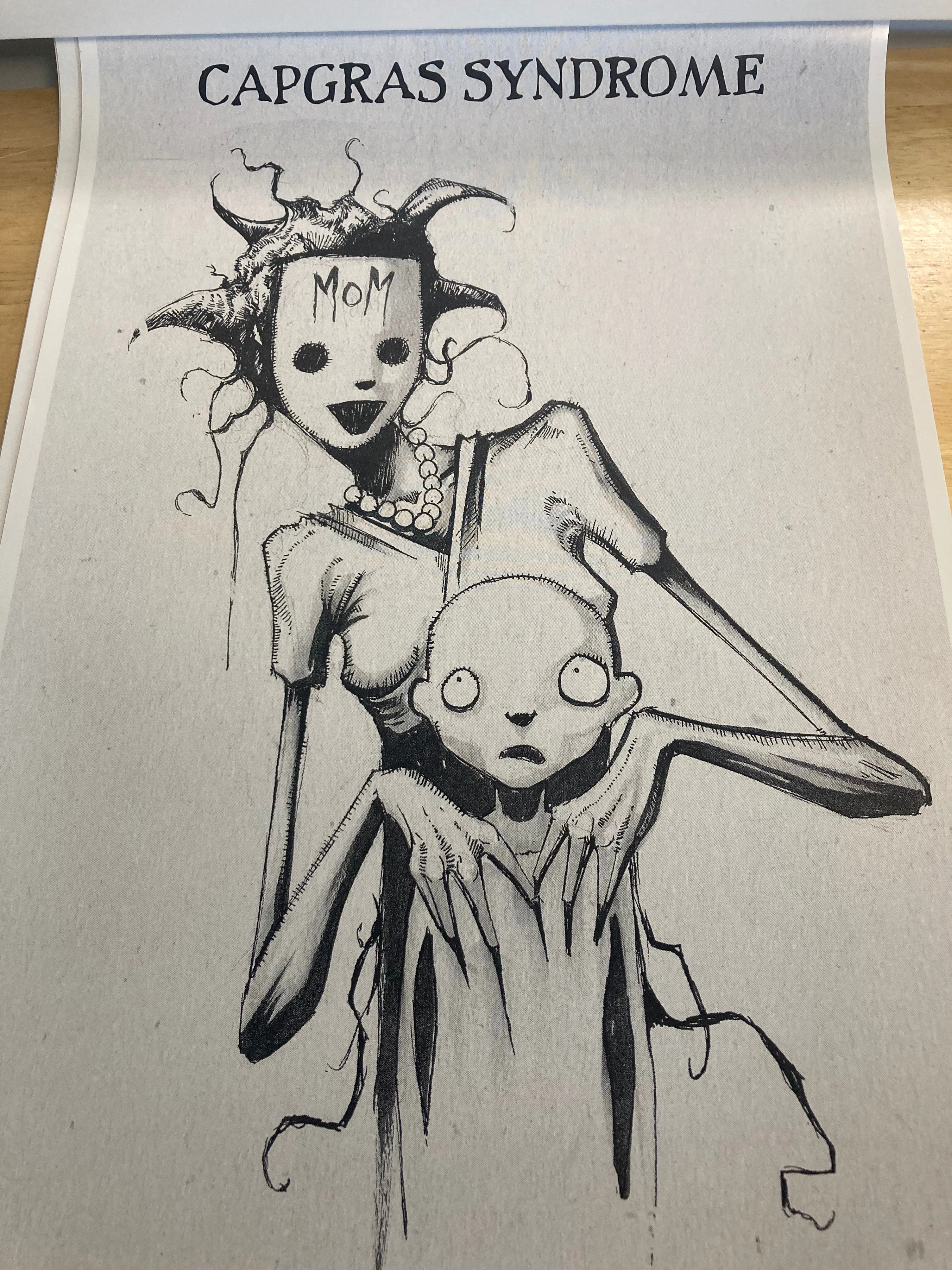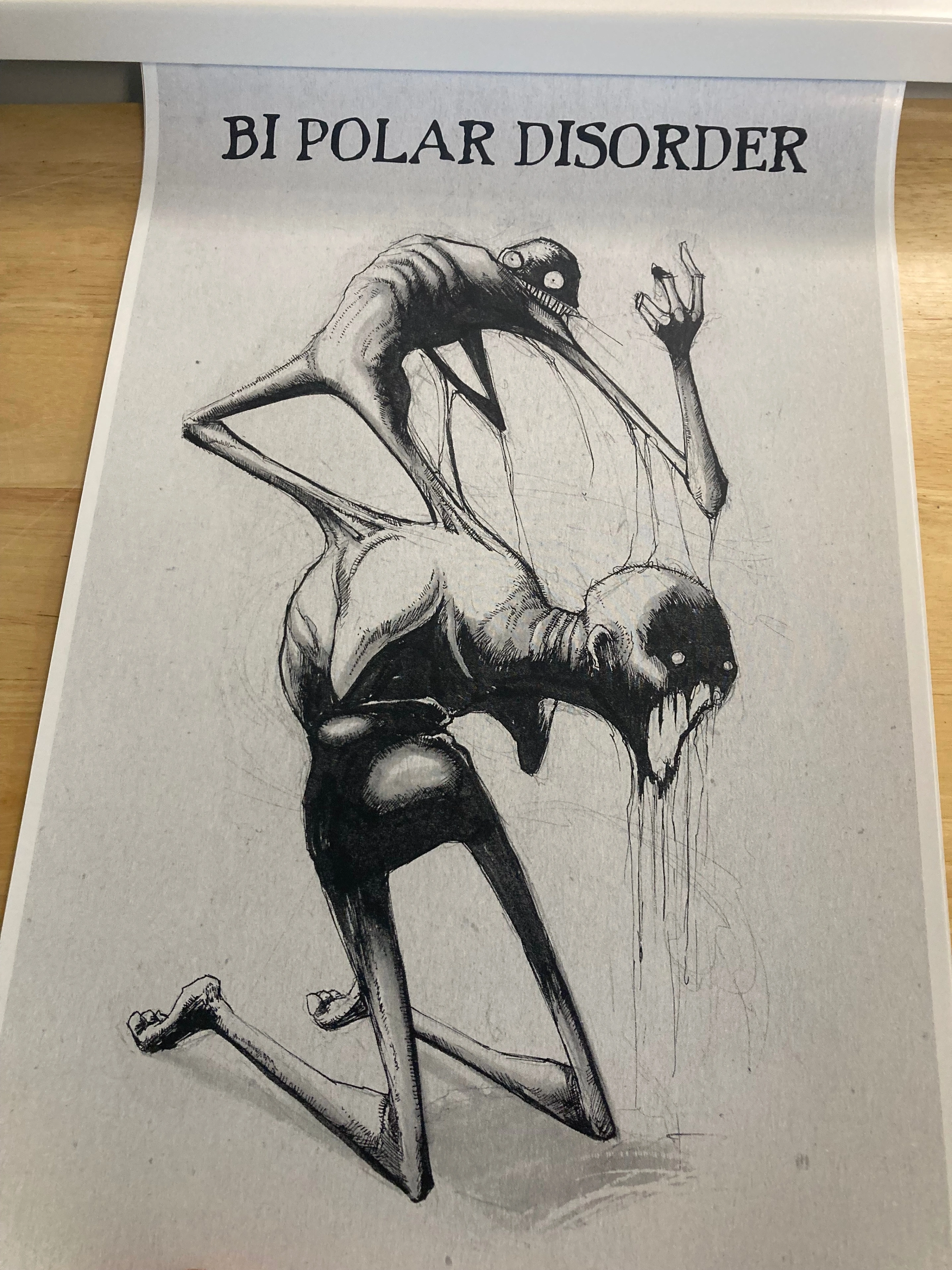 GRAPHIC ART PRINT BY ARTIST SHAWN COSS Ohio-based artist: Shawn Coss is known for his dark art and has been working professionally for 9 years. Influenced by horror and medical background: Coss's art is inspired by horror movies and his medical background, which informs his depiction of mental illness. Mental health advocate: He created the mental health series "Inktober Illness" as part of the annual Inktober series to help create a conversation on mental health. Social media presence: Coss is a social media personality known for posting artistic creation videos on his Instagram account, which has over 250,000 followers. Artistic journey: Coss's artistic journey began at a young age, with a strong interest in darker imagery and art. Shawn Coss's work not only showcases his artistic talent but also his commitment to raising awareness and understanding of mental health issues. His series "Inktober Illness" has resonated with many, and his influence extends beyond the art world, impacting conversations and discussions about mental health. UNFRAMED 11 X 17 PRINT FROM 2016 $ 10 EACH CHECK OUT MY NUMEROUS ADS OF ABOVE ARTIST FOR MORE GRAPHIC PRINTS