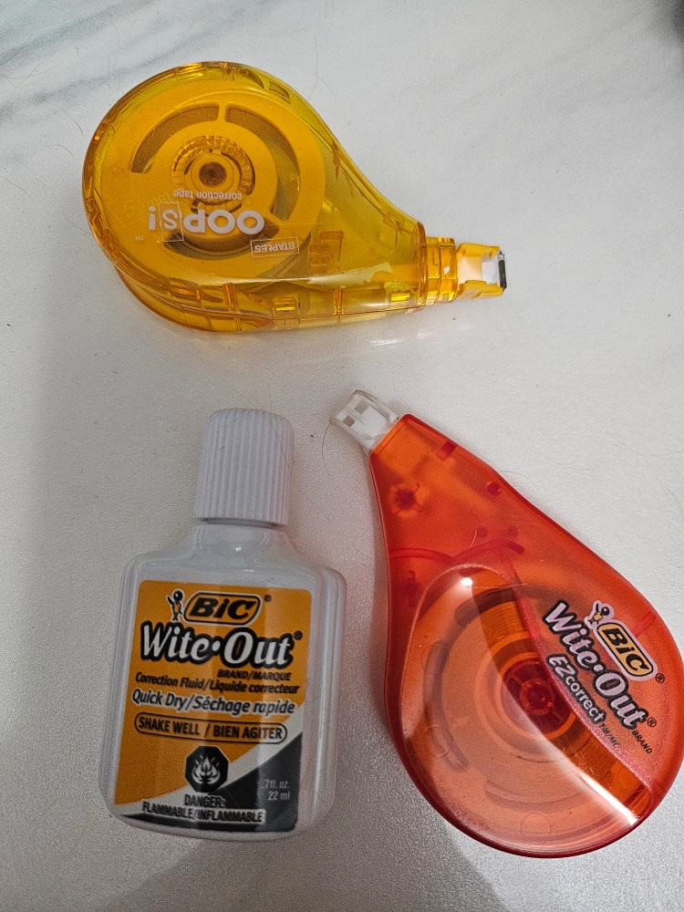 Selling a mix of correction supplies! Included are: - BIC Wite-Out Correction Fluid (7 fl oz / 22 ml) - BIC Wite-Out EZ Correct Tape - Staples OOPS! Correction Tape Perfect for school, work, or home use!