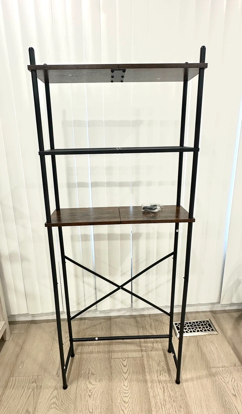 Selling an over-the-toilet storage shelf! It's a great way to add some extra storage to your bathroom, especially if you're short on space. The shelf has a brown wood finish and a black metal frame, giving it a modern look that would fit in well with most decor. It's in great condition and ready to use!