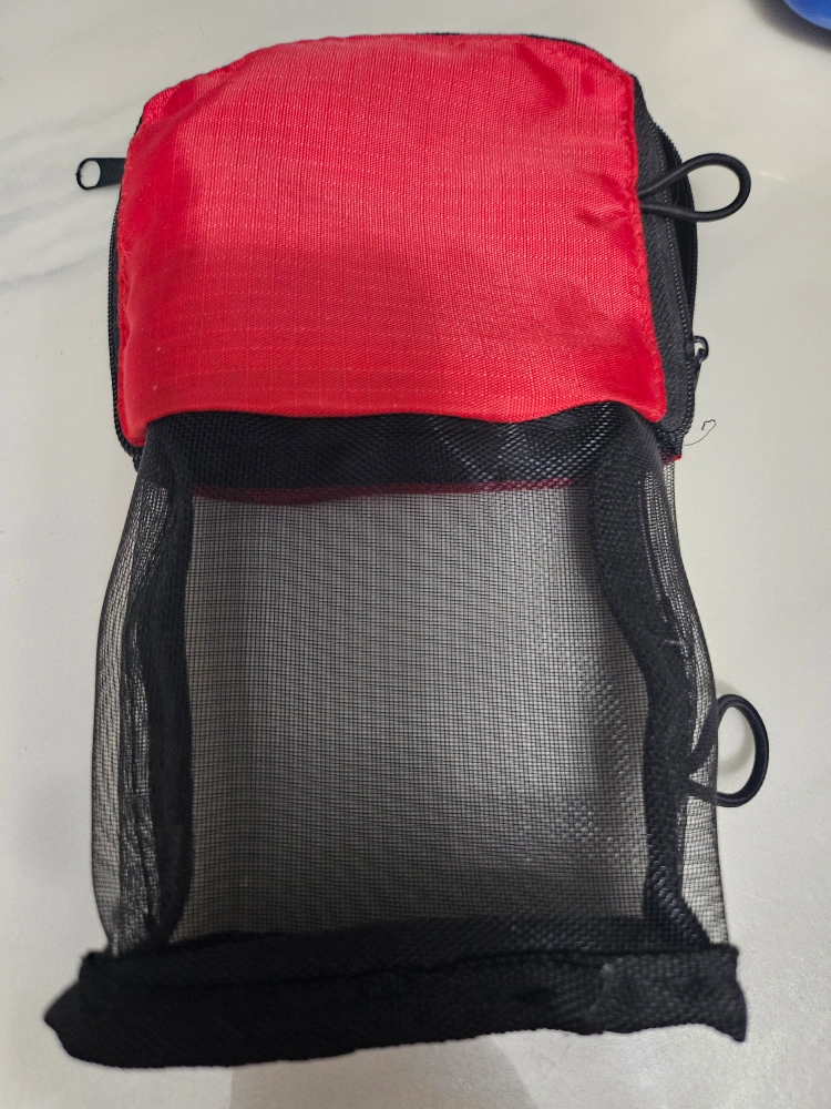 This is a red and black mesh bag. It looks to be in good condition and could be used for a variety of purposes.
