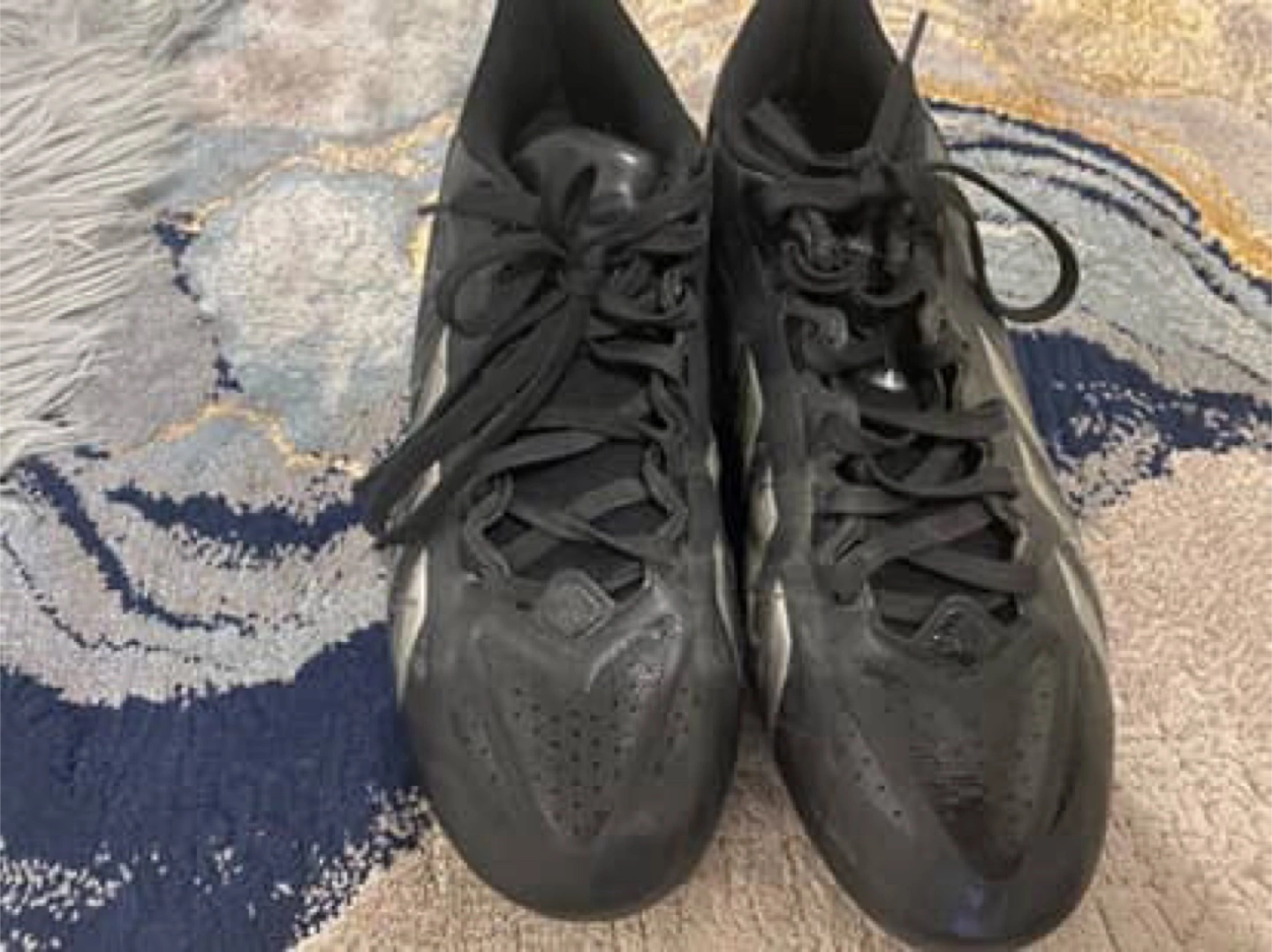 Selling a pair of Adidas football cleats in great condition. They are black with silver stripes and have the Adidas logo on the bottom. Size US 9, UK 8.5, FR 42 2/3, JP 270. Perfect for your next game!