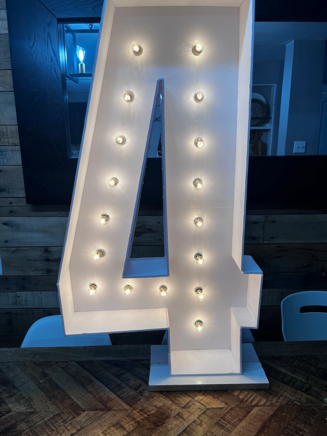 Add a fun touch to your next party with this marquee light in the shape of the number 4! It's in great condition and ready to light up your event. Homemade. Pick up only. Closest intersection is Jane St and Eglinton Ave