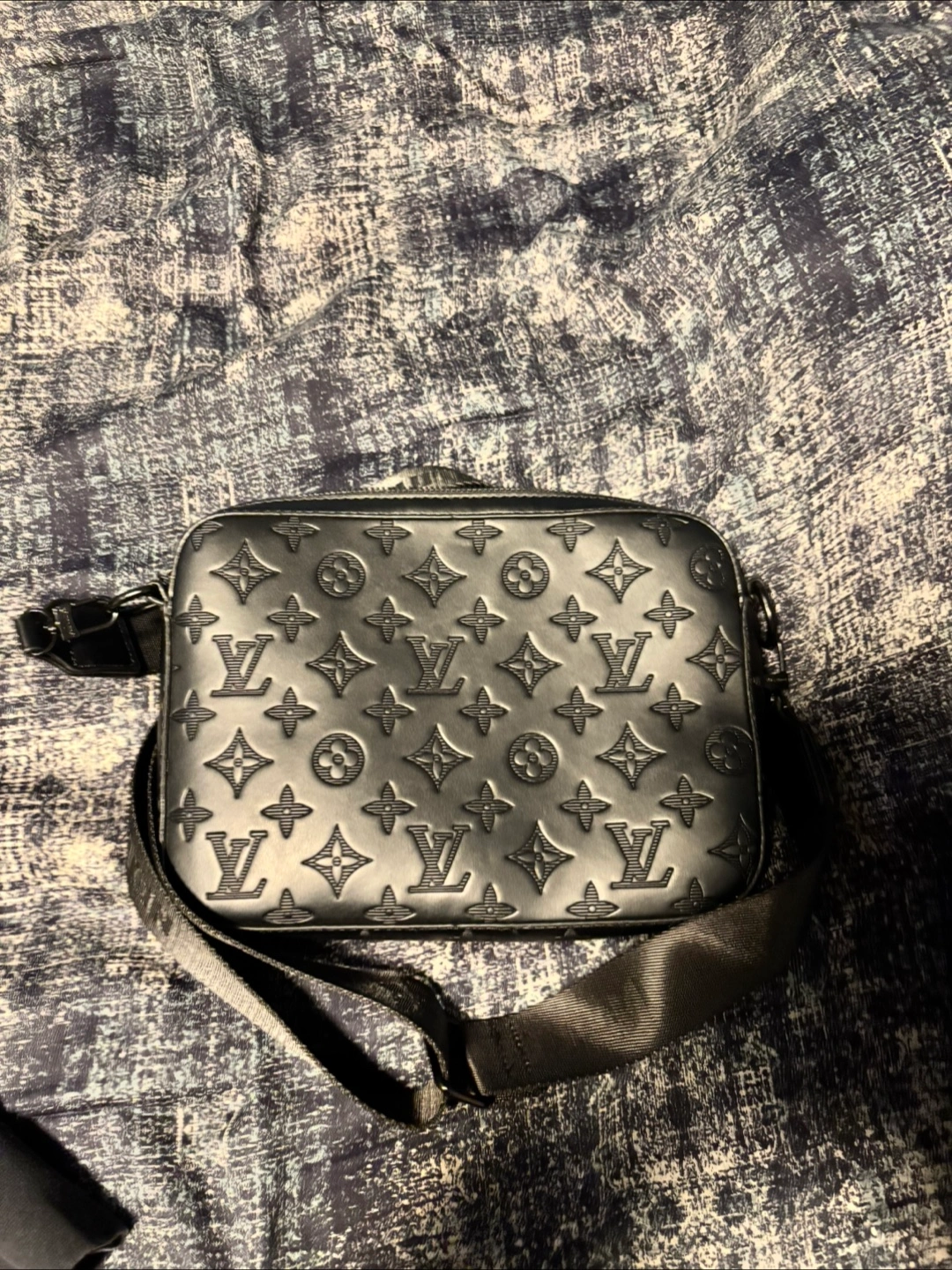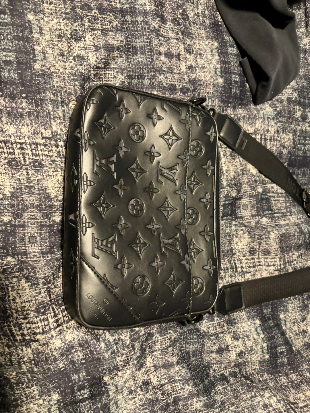 Louis Vuitton messenger bag in black leather with embossed logos. This stylish bag is perfect for everyday use and is in great condition! Feel free to ask any questions