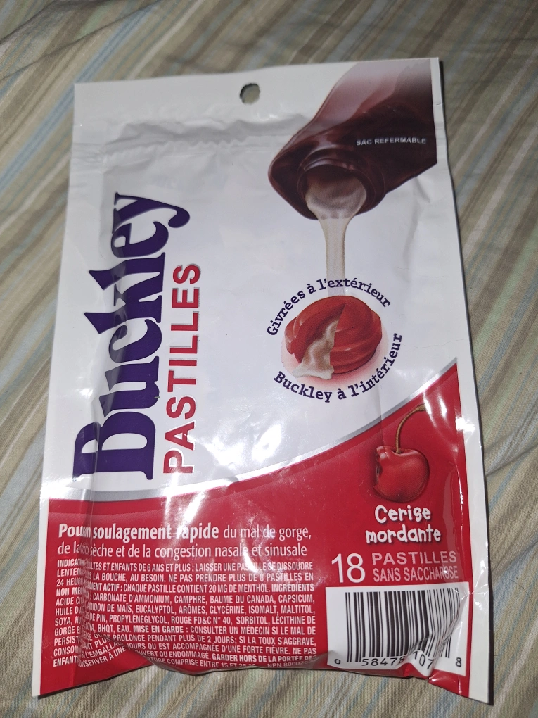 I'm selling a sealed package of Buckley's throat lozenges. These are the cherry flavour and come with 18 pastilles in the pack. Great for soothing a sore throat and relieving nasal congestion!