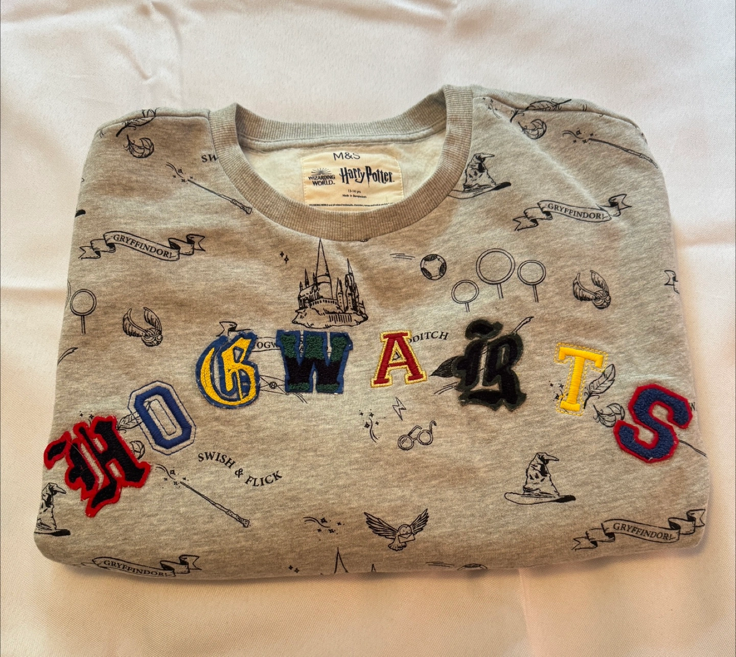 Cozy M&S sweatshirt featuring Harry Potter's Hogwarts! It has a grey colour and is covered in Hogwarts and Gryffindor themed designs.