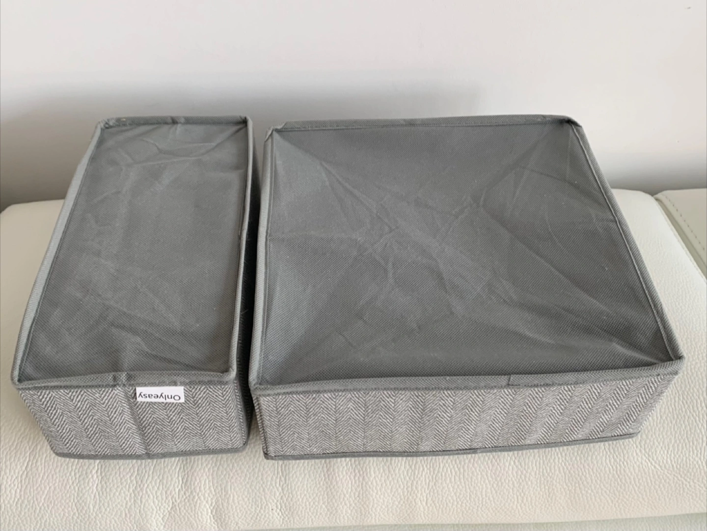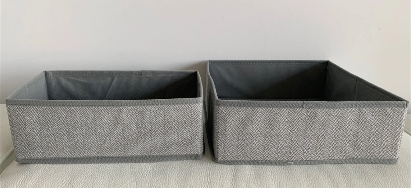 Selling a set of two grey fabric storage bins! They feature a stylish herringbone pattern on the outside and a solid grey lining inside. Perfect for organizing shelves or drawers. Please, msg with exact day and time you would like to come pick it up. Cash. No holds. Thx! 💛Psst, take a look at my other listings to save money!