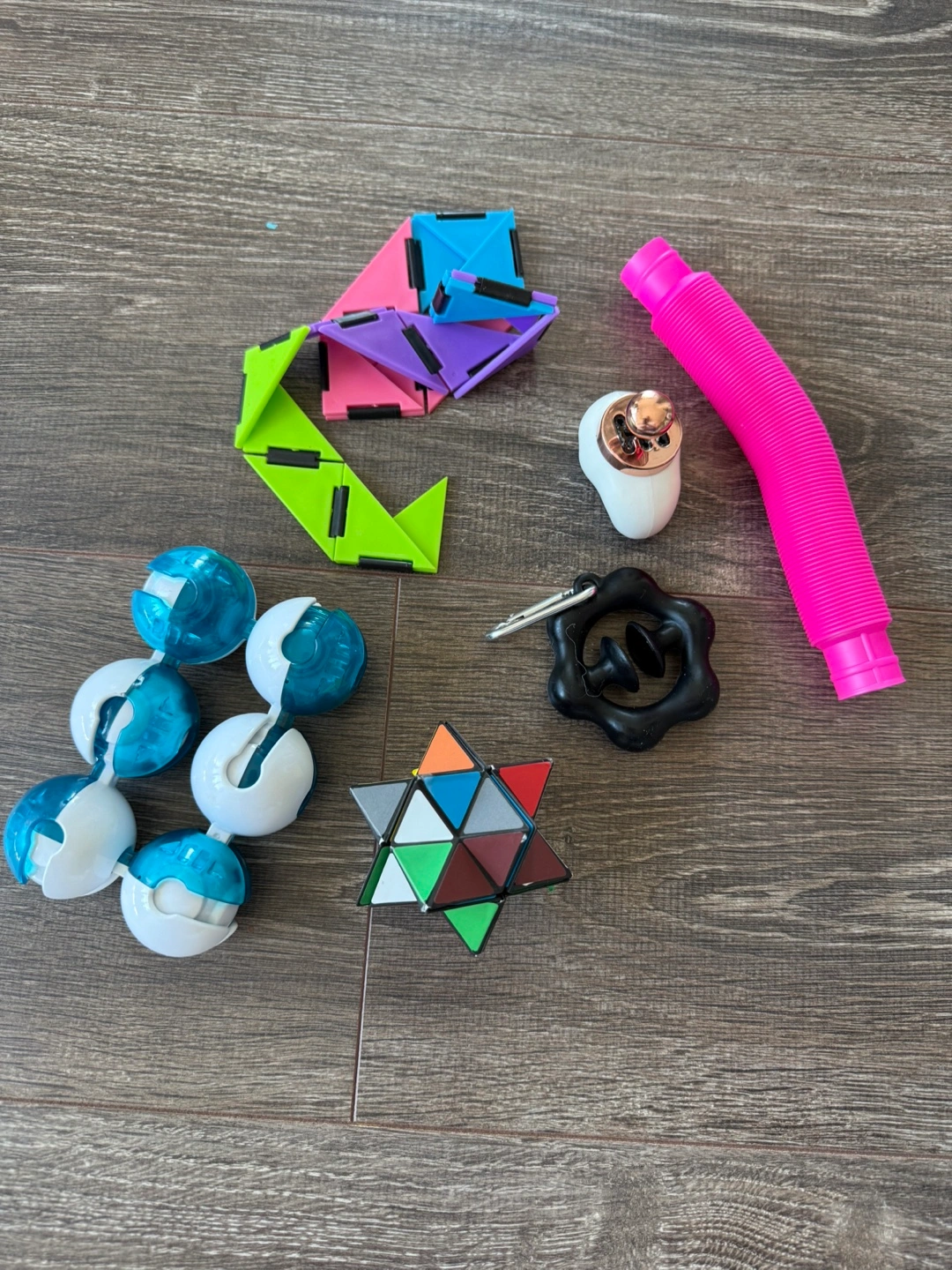 Selling a collection of various fidget toys. Includes a pop tube, magnetic balls, and other interesting shapes for sensory play. Great for kids and adults who like to fidget!