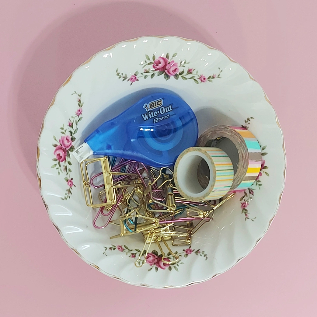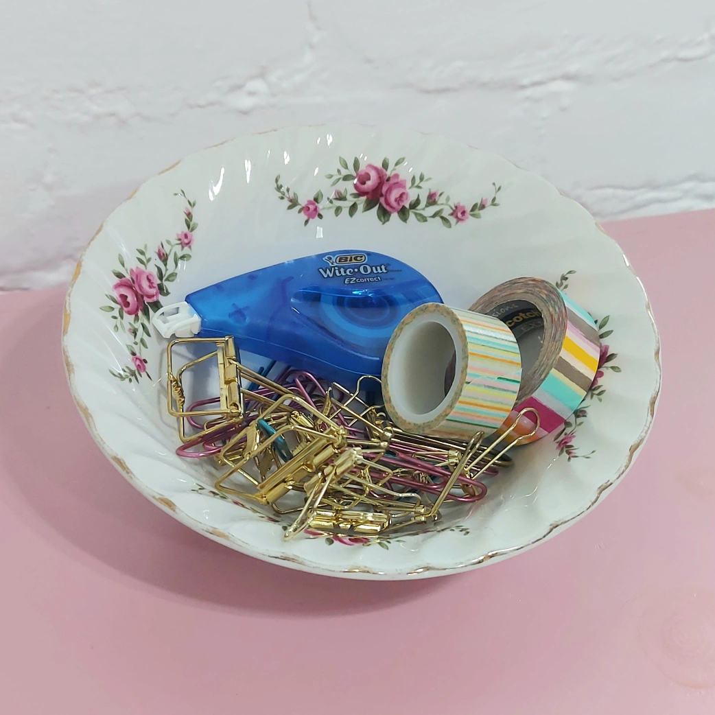 Cottage core stationary bowl with dainty rose patternβ an aesthetic touch to organizing your desk, workspace, or study area. Please note: stationary supplies are not included, and were used for demonstration purposes π From a pet free and smoke free home. π©· I have confirmed breast tumors (not currently cancerous). Everything listed needs to GO! Please share this listing ππ©· For mutual safety, I do public meet ups at the North Bay Police Station located at 135 Princess Street West. There is a monitored 'Buy & Sell Exchange Zone' shared with the visitor parking lot at the front of the station. Listed at $1. Trades acceptedβ I would be looking for a $1 trade value for an ISO item or something of interest from your profile. ISO items: shampoo, nail polish, body mist/fragrance, 100% cotton sewing thread, 100% cotton denim, note books. Check out my other listings and thanks for looking!
