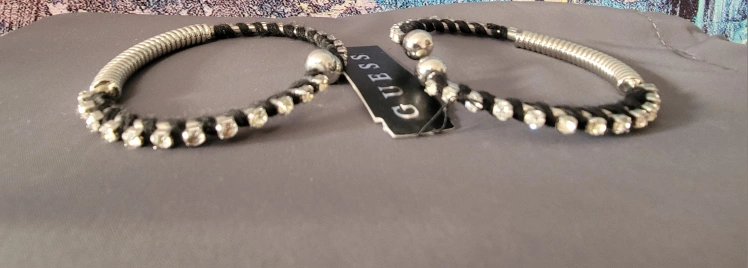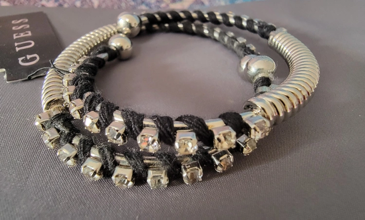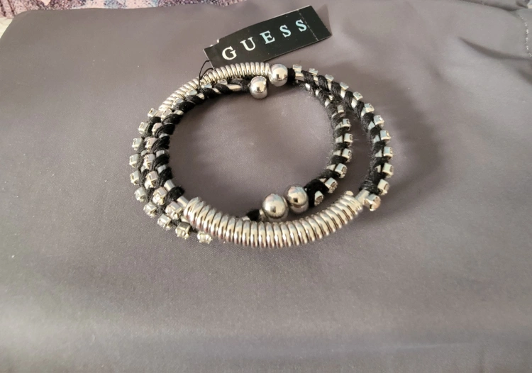 Selling a brand new Guess wrap bracelet! It's a silver and black bracelet that wraps around your wrist. It has some sparkly accents too!