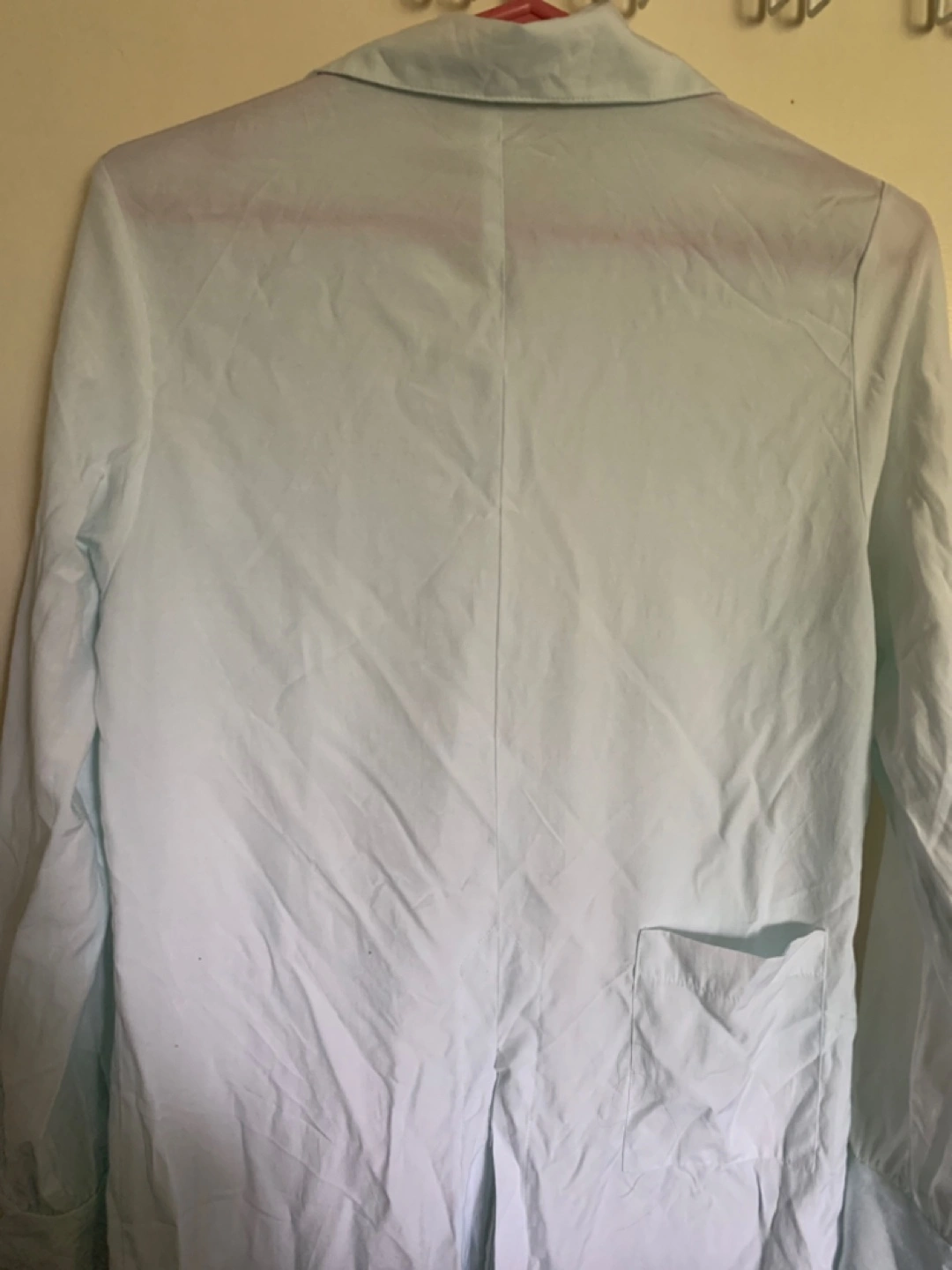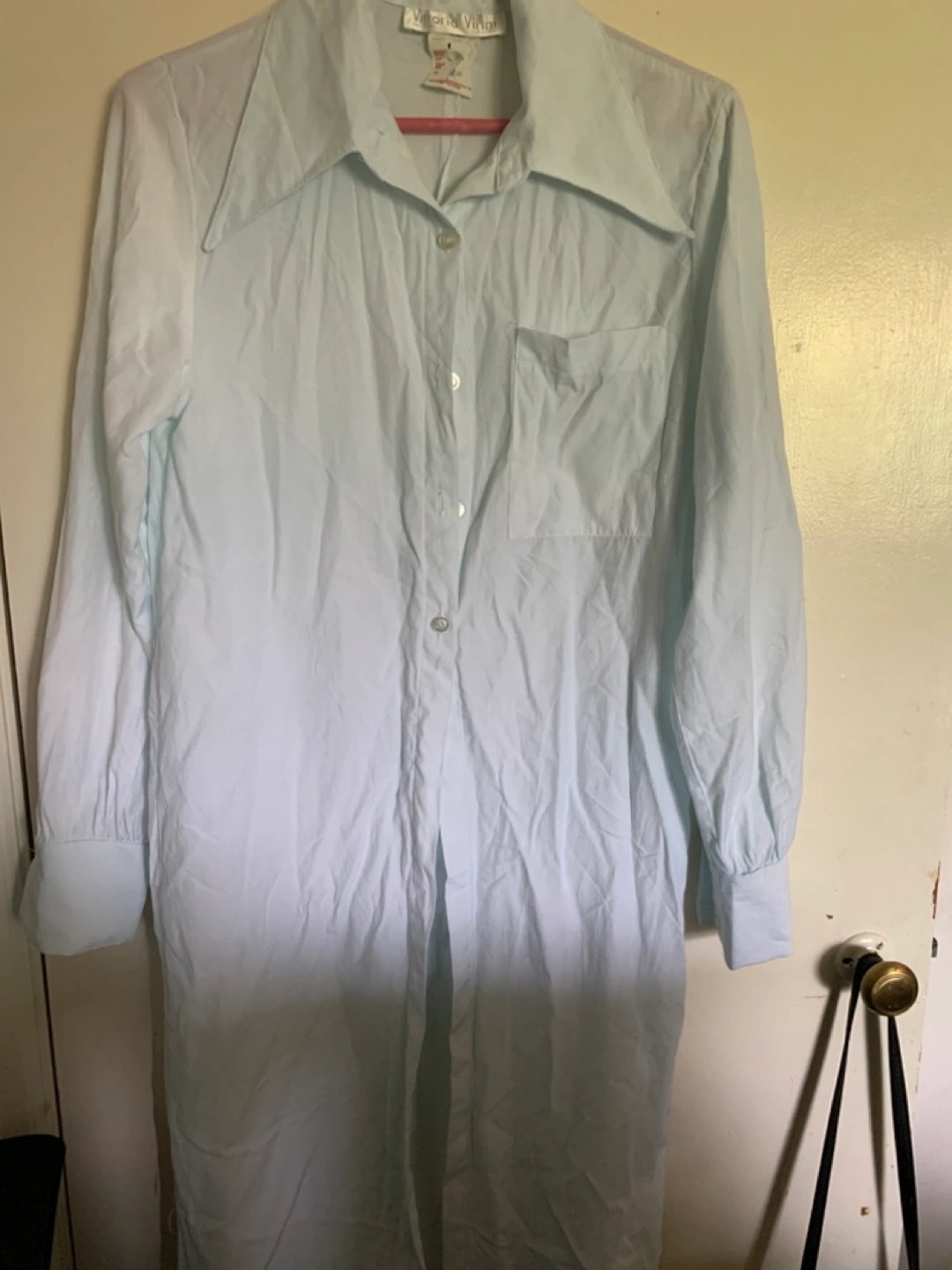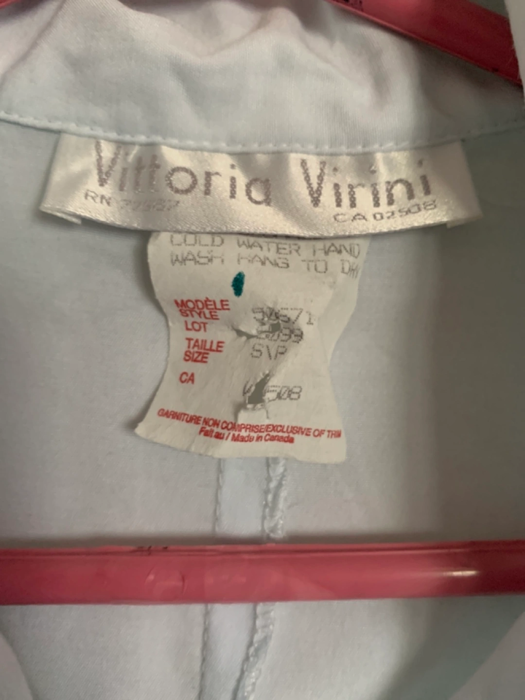 Here's a cute Vittoria Virini shirt dress! It's light blue and in size S/P. It's made in Canada.