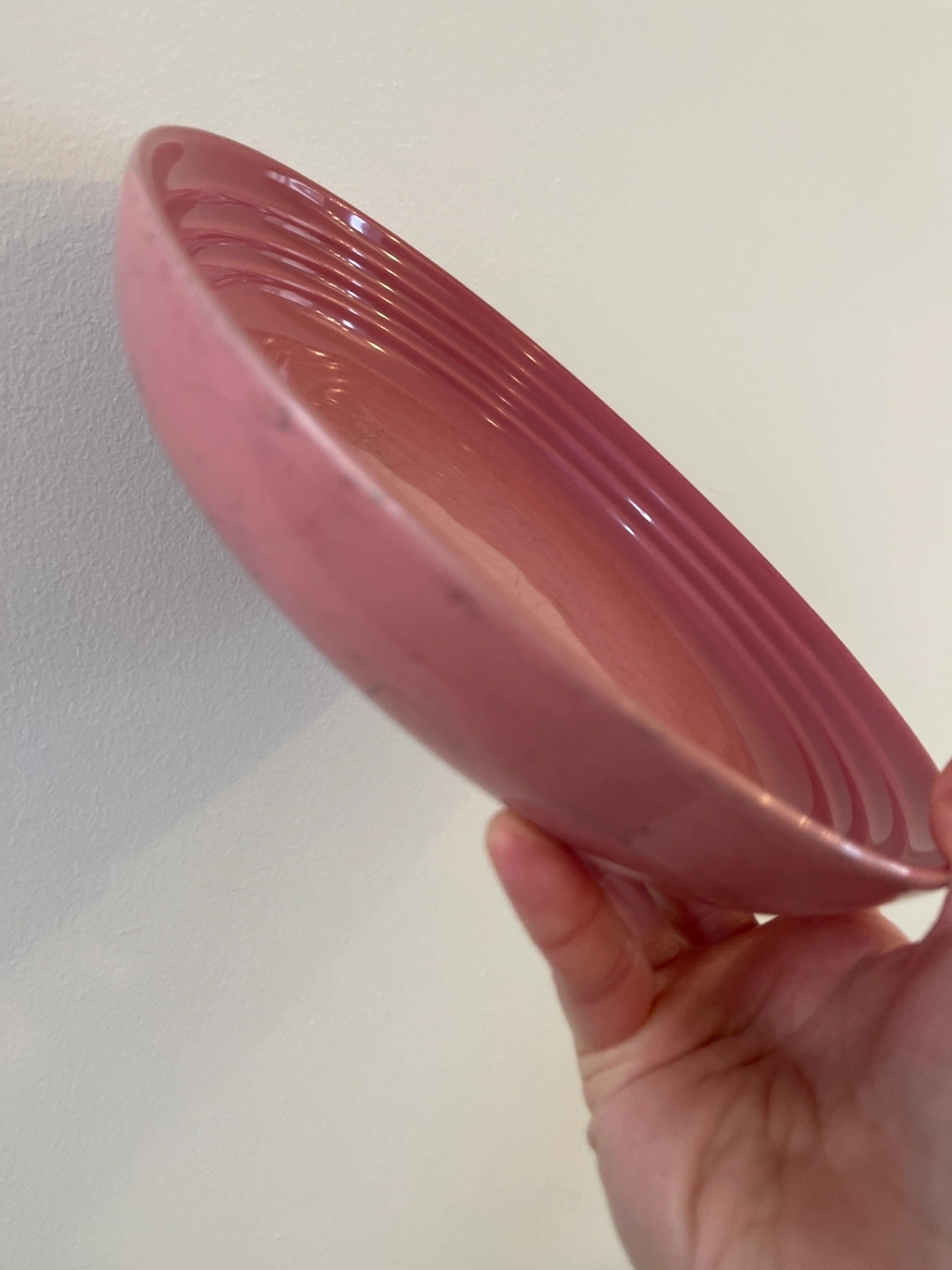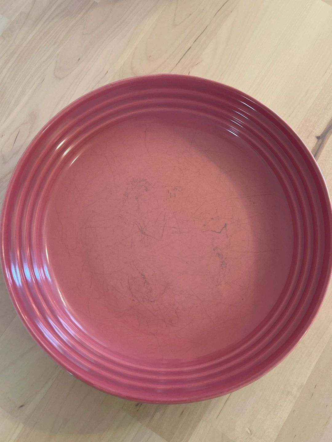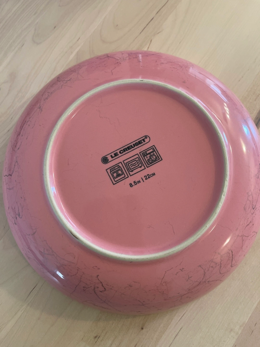 Selling a Le Creuset dinner plate in pink! It's 8.5 inches (22cm) in diameter. There are some signs of use, but it's still in good condition for everyday use