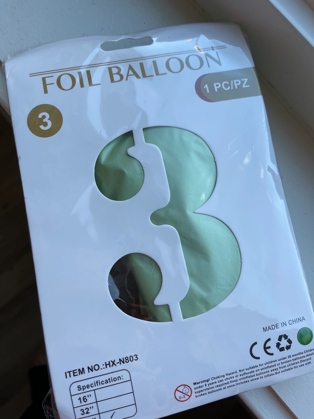 Selling a foil balloon in the shape of the number 3! It's still in its original packaging. The balloon is 32 inches in size. Perfect for a birthday or special occasion!