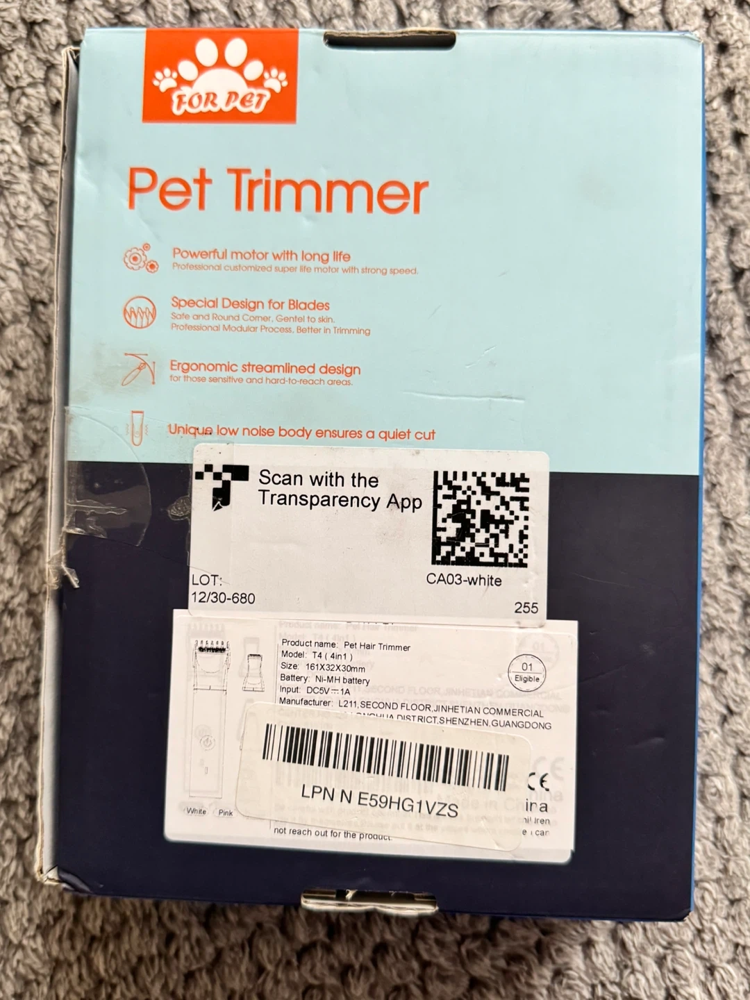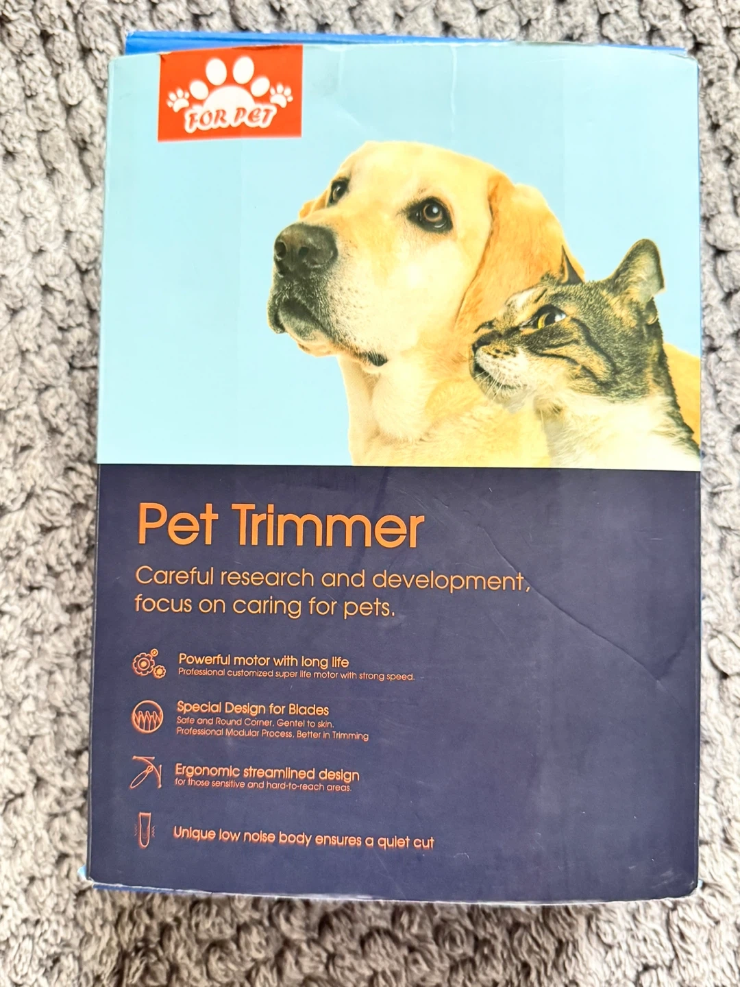 Sold as is. Selling a like new FOR PET T4 (4in1) Pet Hair Trimmer! This pet trimmer features: - Powerful motor with long life - Special design for blades, safe and round corner, gentle to skin - Ergonomic streamlined design for those sensitive and hard-to-reach areas - Unique low noise body ensures a quiet cut It comes with the original box and all included components!