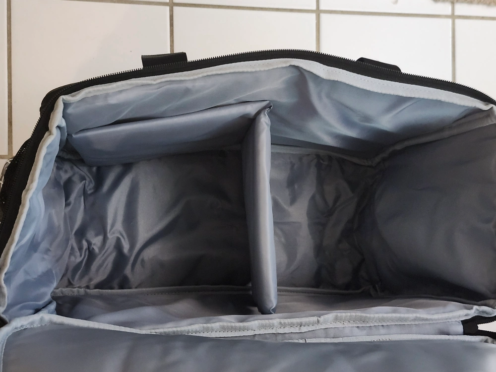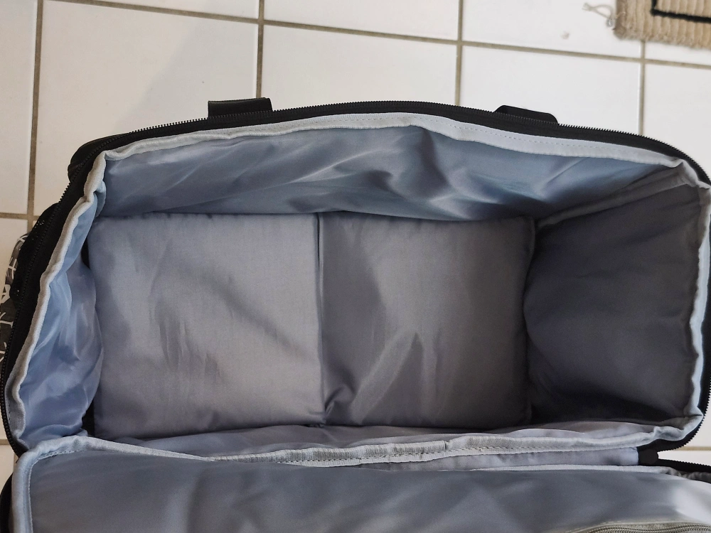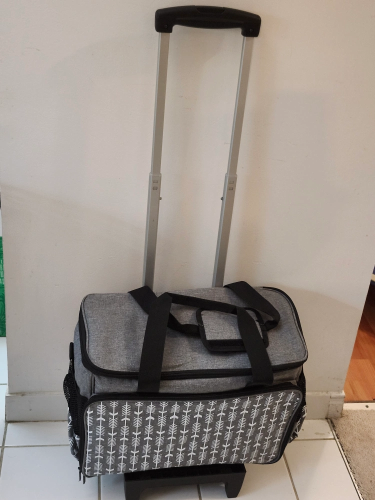 Here's a rolling craft tote bag in great condition! It features a retractable handle and smooth rolling wheels, making it super easy to transport your supplies. The interior is spacious and has dividers to keep everything organized. The exterior is a stylish grey with a fun arrow pattern.