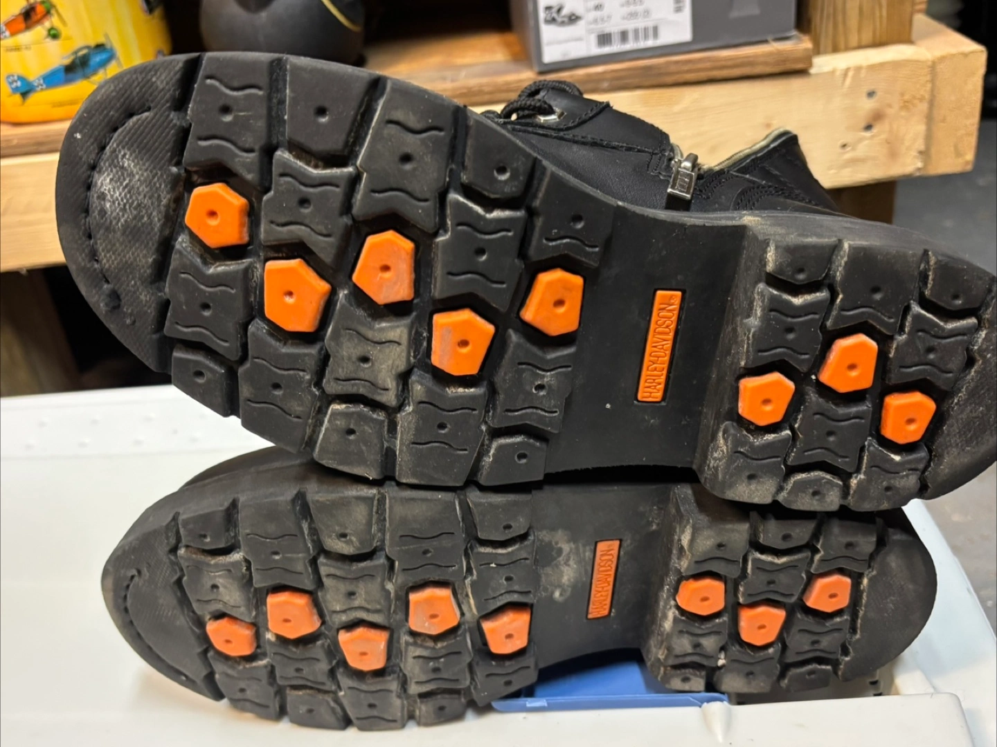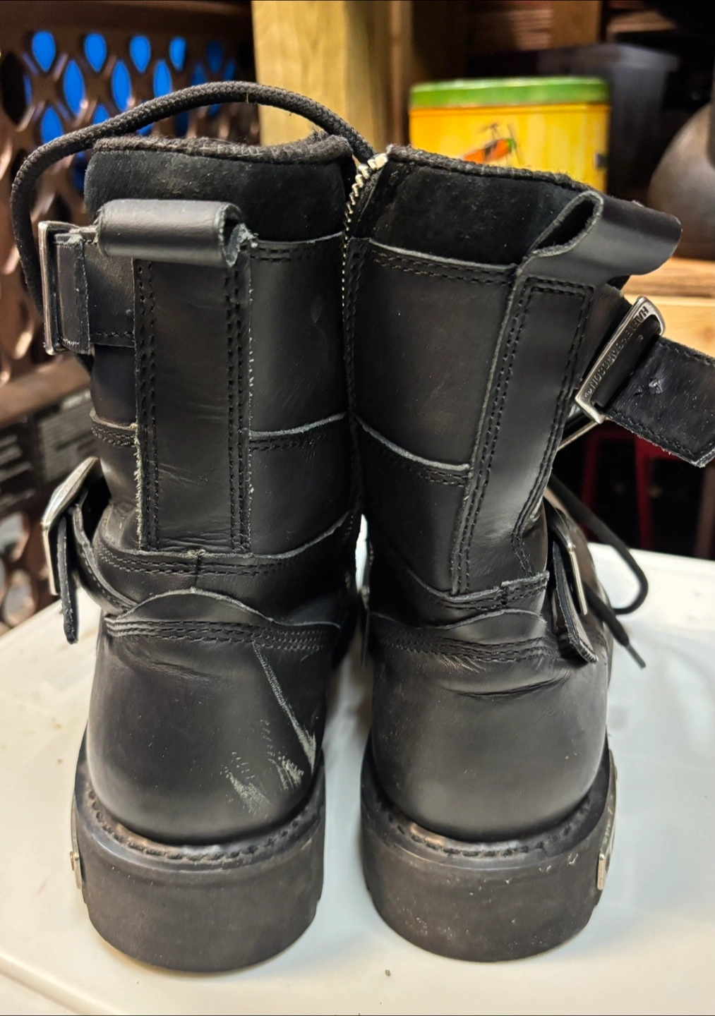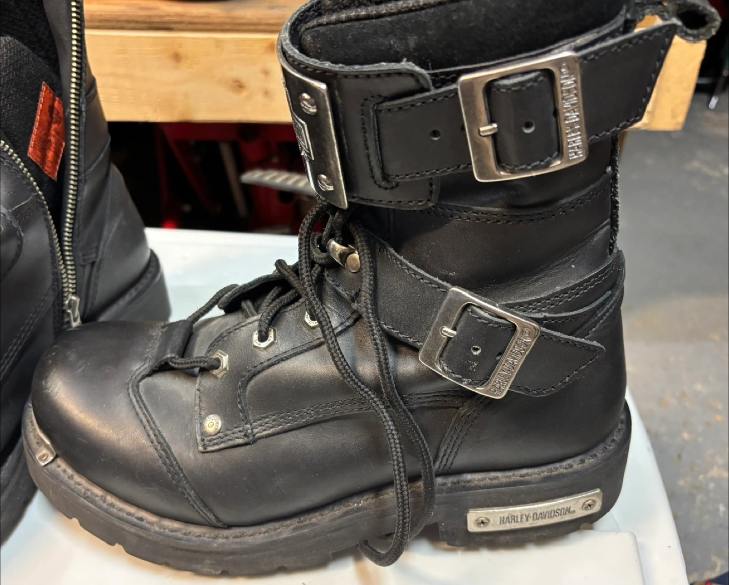 Selling a pair of Harley-Davidson motorcycle boots in size 9. They are black leather with buckle detailing and a zipper. The boots are wide/large cash only on pickup no e-transfer address will supplied with an ETA and no phone number