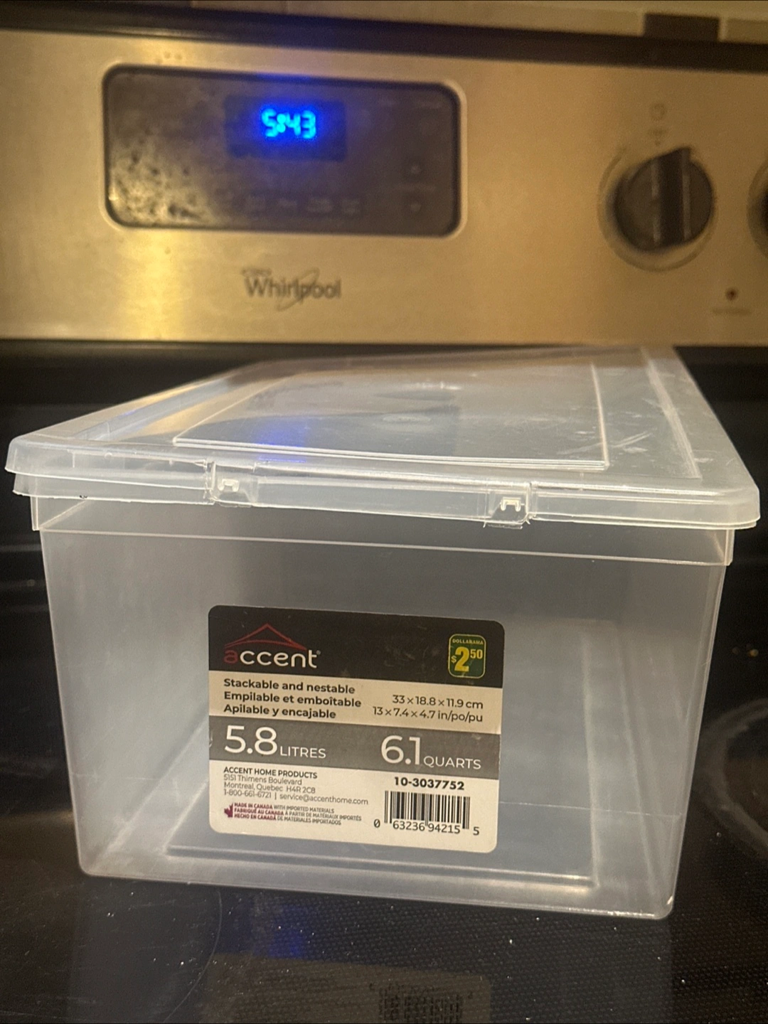 Selling a stackable and nestable storage box from Accent. It's clear, so you can easily see what's inside! It holds 5.8 litres and measures approximately 33 x 18.8 x 11.9 cm, or 13 x 7.4 x 4.7 inches.