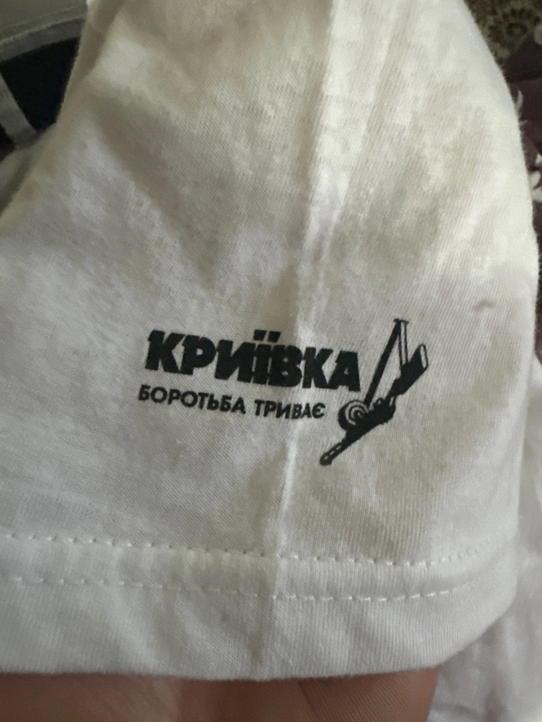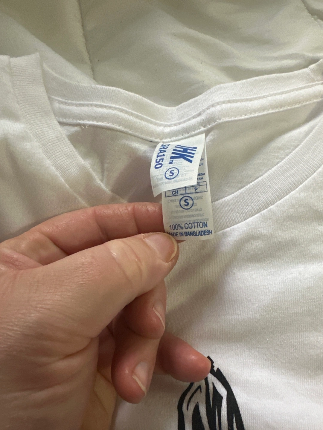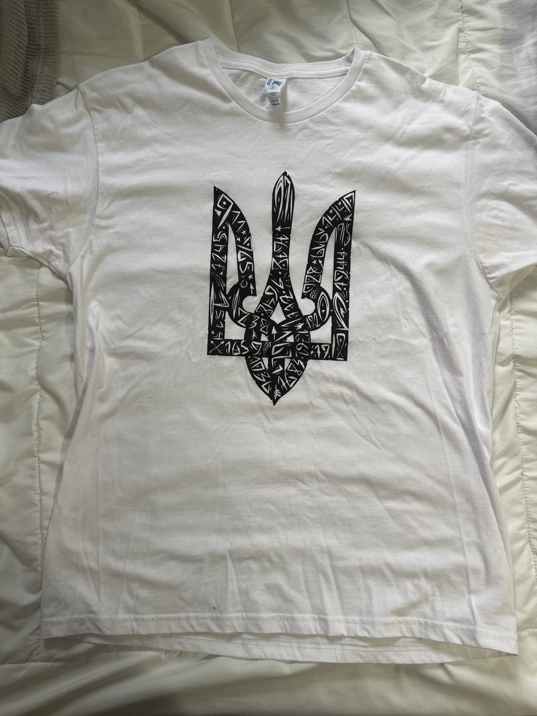 I'm selling a white t-shirt in size small. It features a black design on the front and is made of 100% cotton. It's in great condition and ready for a new home