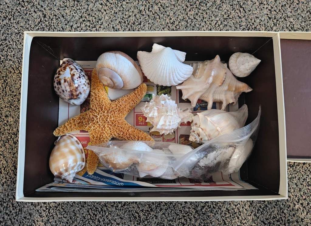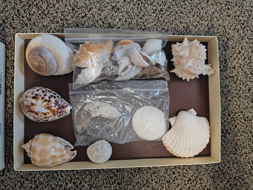 A collection of seashells in a Coach box. The box is ivory, milky, and gold in colour. Perfect for a beach-themed decor or for your fish tank! Can sell big shells individually or a few shells for a lower price.